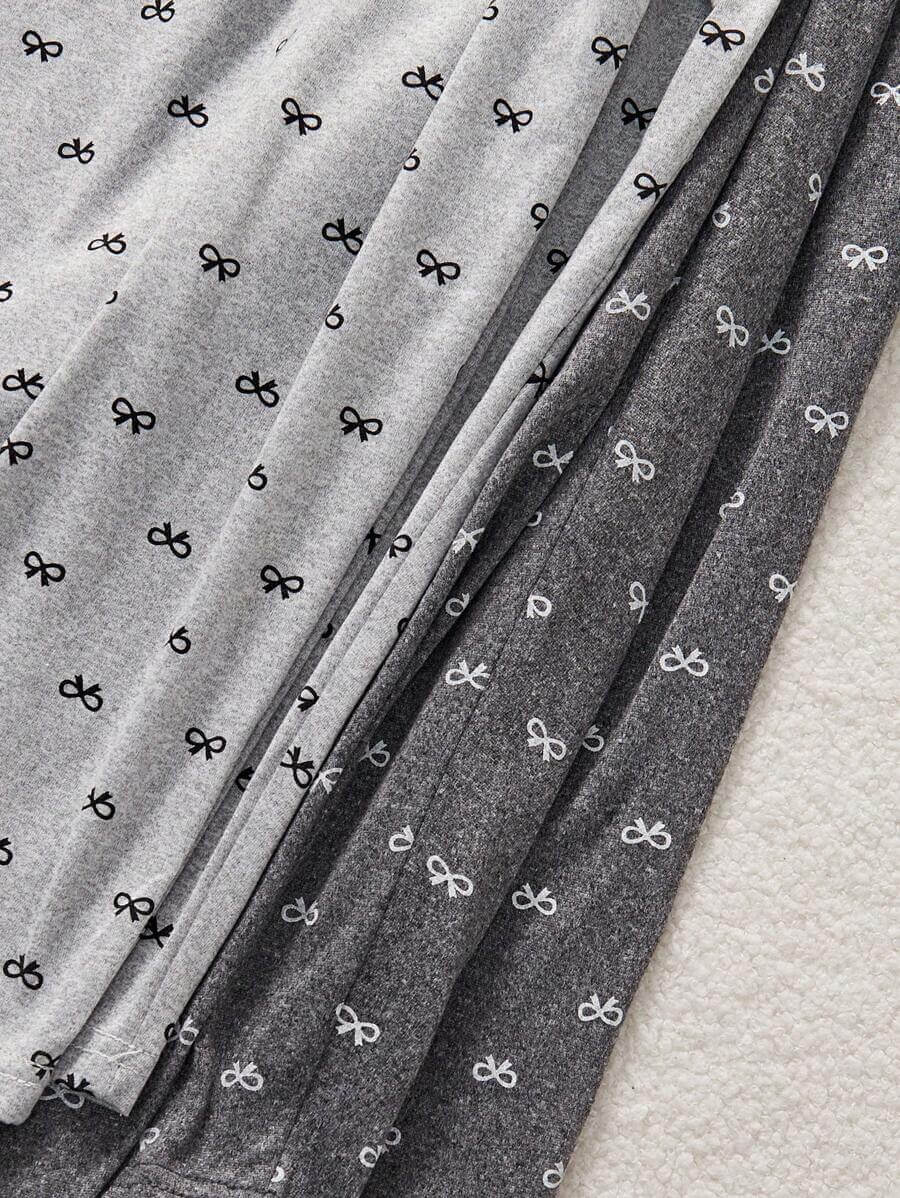 بنطلونان طويلان من خامة قطنية ناعمة بطبعة فيونكات صغيرة متكررة. التصميم بسيط بخصر مطاطي مع رباط خفيف للتعديل. الخامة مرنة ومريحة للحركة، والطول مناسب للارتداء اليومي أو في البيت. الألوان متناسقة بدرجات الرمادي الفاتح والغامق.