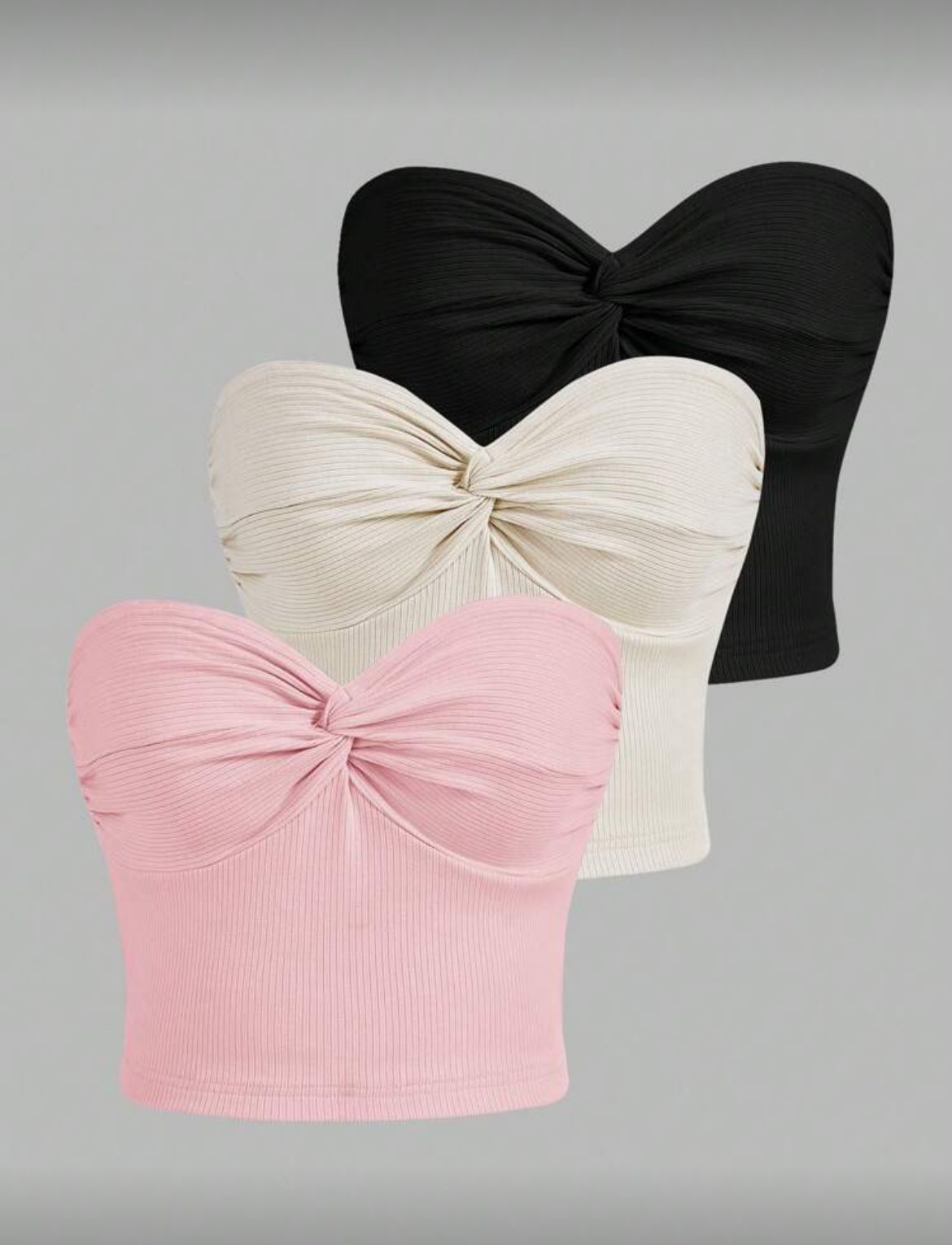 توب عملي بدون حمالات مناسب لفصل الصيف 🌸، معمول من خامة قطنية مطاطة مريحة، بييجي بثلاثة ألوان أساسية تقدر يتنسقوا بسهولة مع أي قطعة تانية. تصميمه البسيط بعقدة خفيفة في المنتصف بيدي لمسة أنثوية هادية.