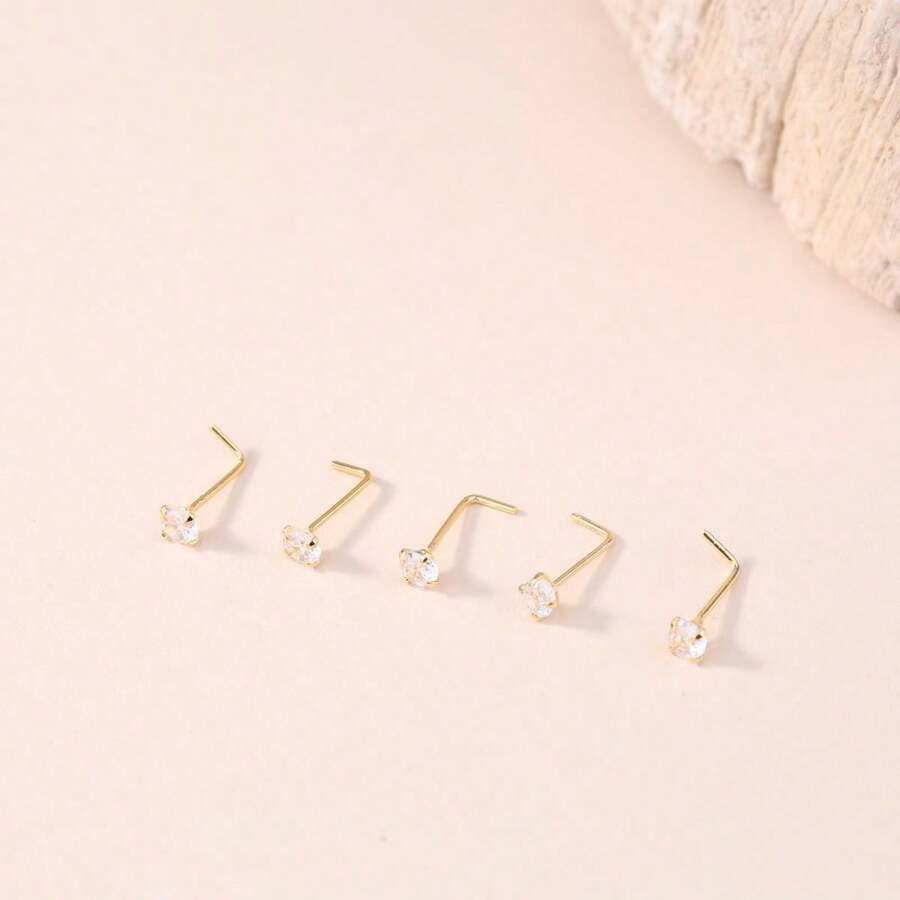 طقم أنيق من 5 حلقات أنف مزوّدة بزركون أبيض لامع بدرجةشمل دبابيس Bone وL Shape لتثبيت مريح وثابت. تصميم بسيط وعصري يناسب النساء لإطلالة يومية جذابة ولامعة.