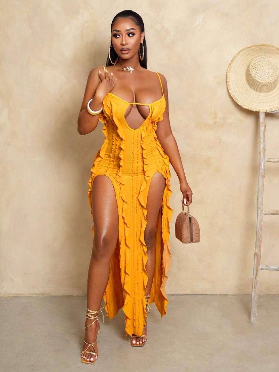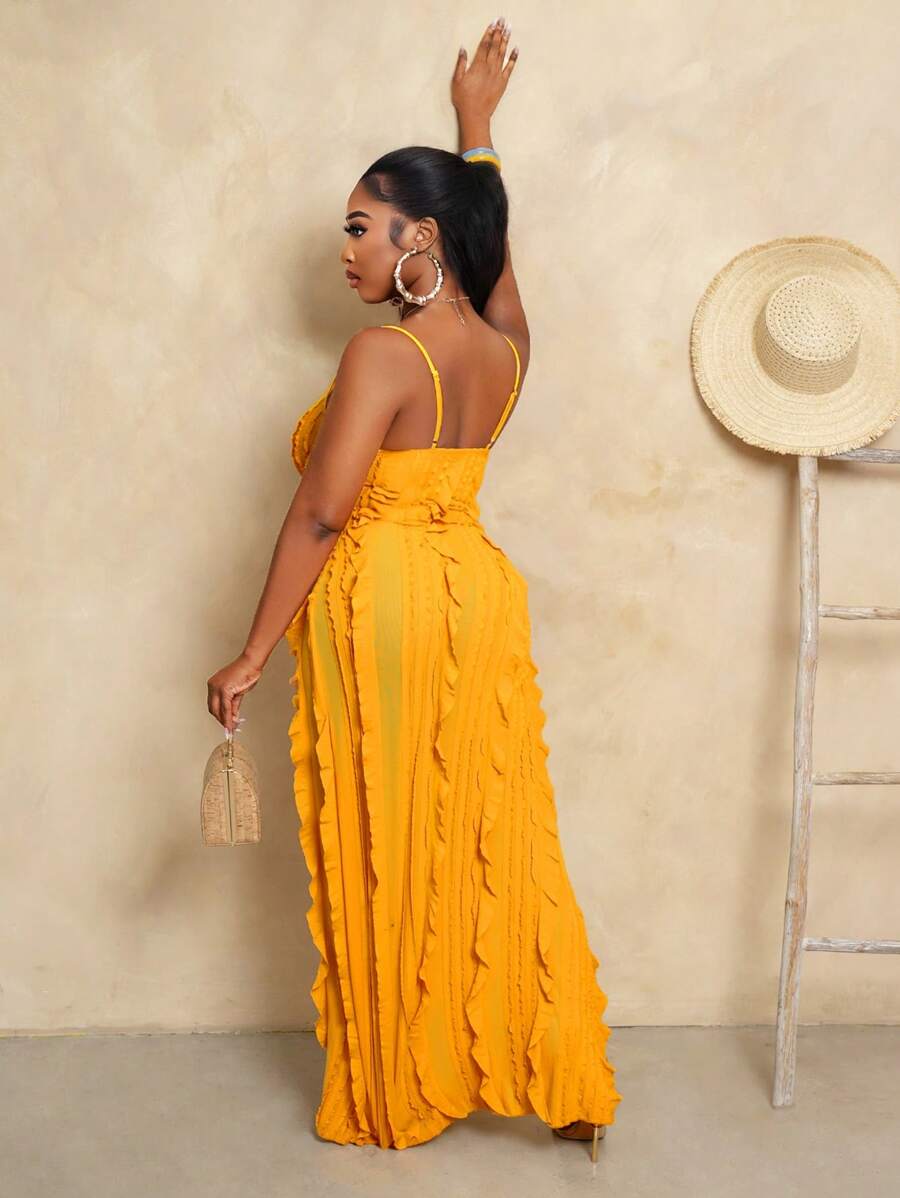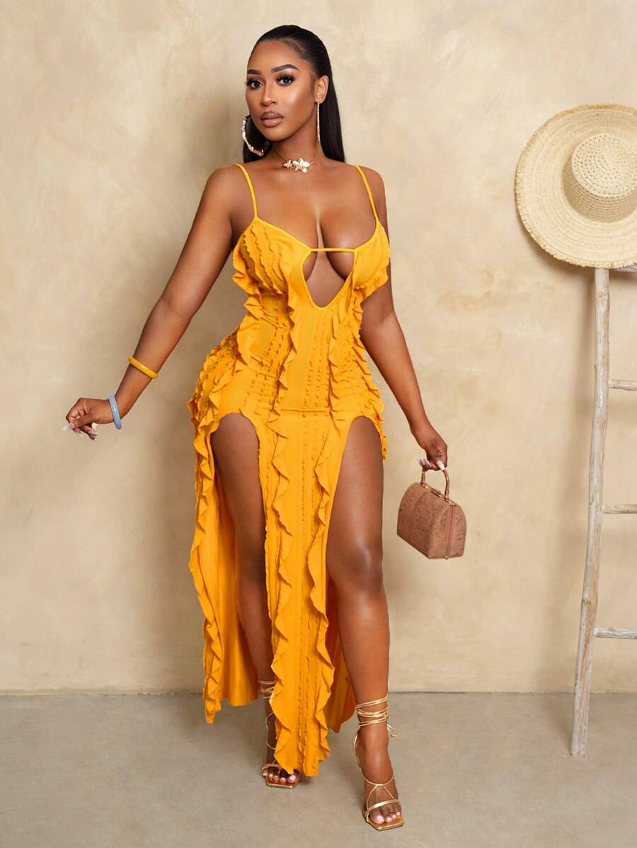 فستان كامي نسائي من BamGleam بلون سادة وحاشية مكشكشة ومنفصلة ومنخفضة الارتفاع Shein
