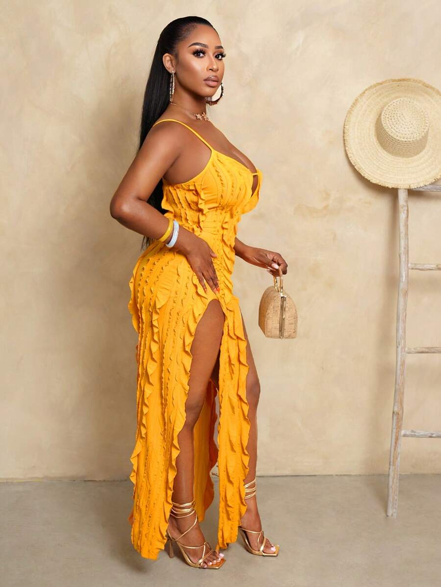 فستان سهرة جرئ وأنيق باللون الأصفر الذهبي المشرق ✨. تصميمه مميز بفتحات جانبية عميقة وكشكشة طولية بتبرز القوام بشكل أنثوي لافت. القماش خفيف وانسيابي بيدي حركة جذابة، والحمالات الرفيعة تضيف لمسة رقيقة على الإطلالة. مثالي للسهرات أو الحفلات اللي بتحبي تظهري فيها بإطلالة جريئة ومختلفة 💛.