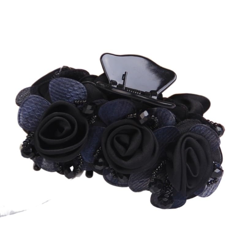 مشبك شعر بتصميم هادئ مزين بورود قماشية باللون الأسود مع تفاصيل خفيفة باللون الأزرق الداكن. الخامات المستخدمة ناعمة وبتحافظ على شكل الوردة من غير ما تتلف بسهولة. المشبك حجمه متوسط وبيثبت الشعر من غير ما يسبب شد أو انزعاج، وبيتناسب مع تسريحات الشعر المختلفة سواء كانت بسيطة أو مرتبة