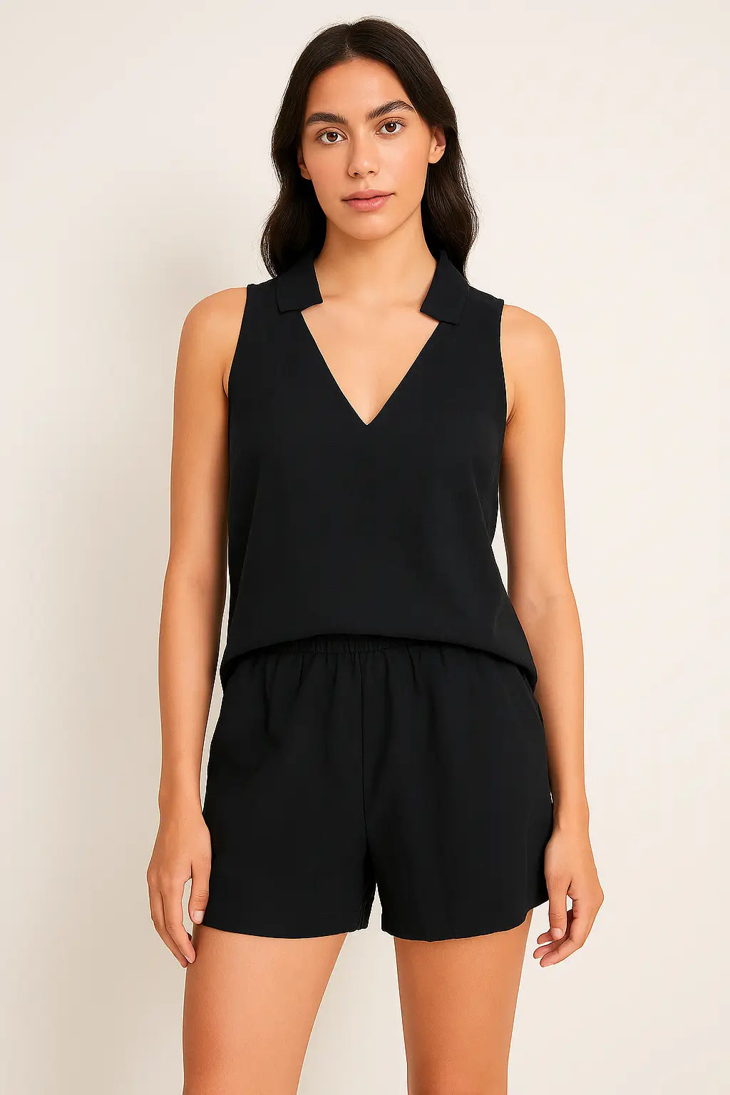 طقم أنيق باللون الأسود من Shein مكون من توب بدون أكمام بياقة V عصرية وشورت قصير مريح بخصر مطاطي. مصنوع من خامة مريحة وخفيفة تجمع بين القطن والبوليستر، ما يجعله خيارًا عمليًا للارتداء اليومي في الأجواء الدافئة. تصميم بسيط وأنيق يناسب الخروجات الكاجوال أو جلسات الاسترخاء بإطلالة عصرية ومريحة.