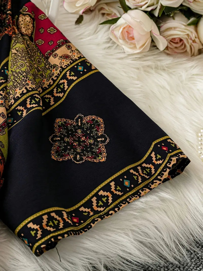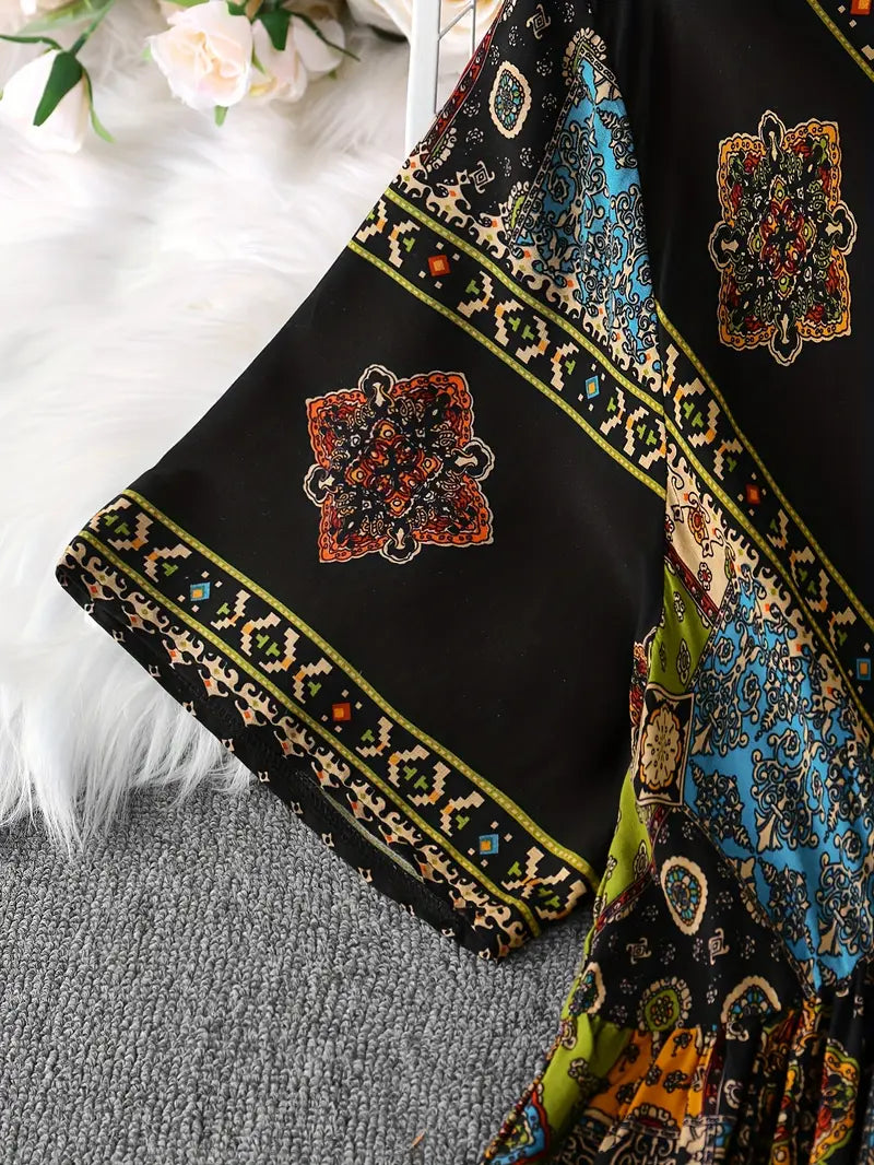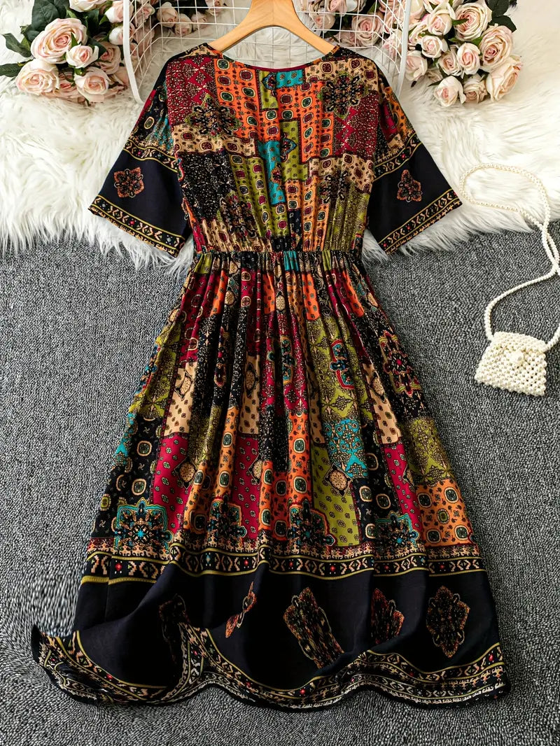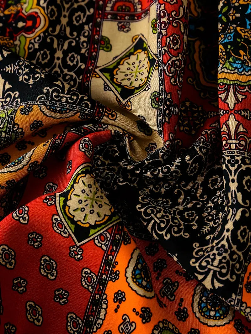 فستان طويل بخامة خفيفة وتصميم بوهيمي يجمع بين ألوان دافئة وزخارف شرقية متنوعة. يتميز بياقة على شكل V وأكمام قصيرة فضفاضة، مع خصر مطاطي يمنح راحة وأناقة في نفس الوقت. مناسب للإطلالات اليومية أو الخروجات الصيفية الهادية