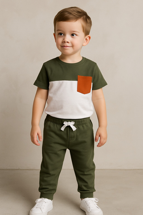 طقم مميز ومريح للأولاد بتصميم عصري بسيط. التيشيرت مكوّن من لونين متناسقين (زيتي وأبيض) مع جيب أمامي باللون البني يضيف لمسة لطيفة، والبنطلون بنفس درجة الزيتي بخامة ناعمة ومرنة. مثالي للّبس اليومي أو الخروجات الخفيفة، خامته مريحة وسهلة الغسيل، ومناسب لحركة الأطفال طول اليوم.
