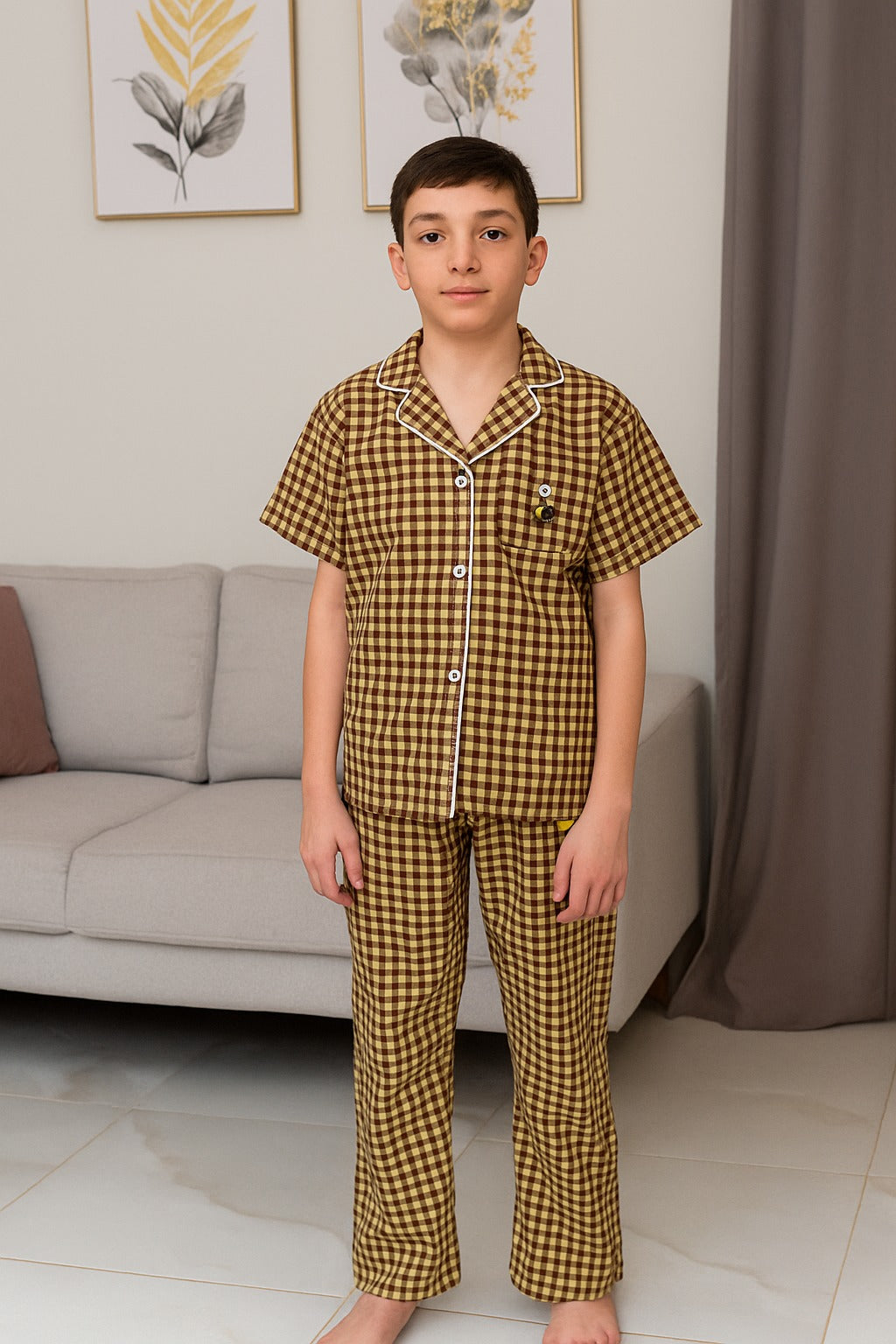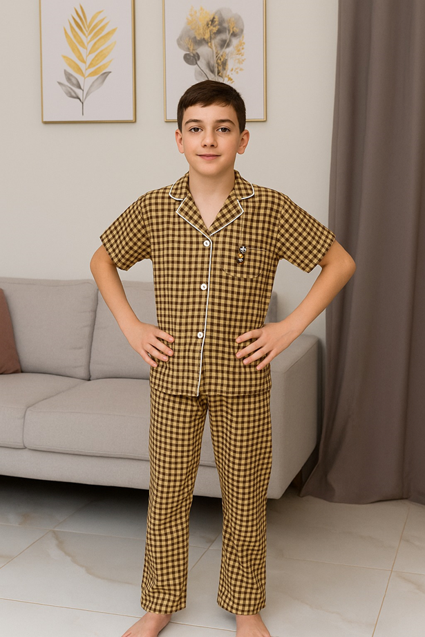 بيجامة أولادي أنيقة ومريحة بنقشة مربعات باللون البني مع خطوط بيضاء بسيطة تضيف لمسة كلاسيكية. مكونة من قميص بأزرار أمامية وبنطلون طويل بقصة مريحة. خامة القطن الناعمة تمنح إحساس بالراحة أثناء النوم وتسمح بتهوية جيدة. تصميم عملي مثالي للاستخدام اليومي والليالي الدافئة.