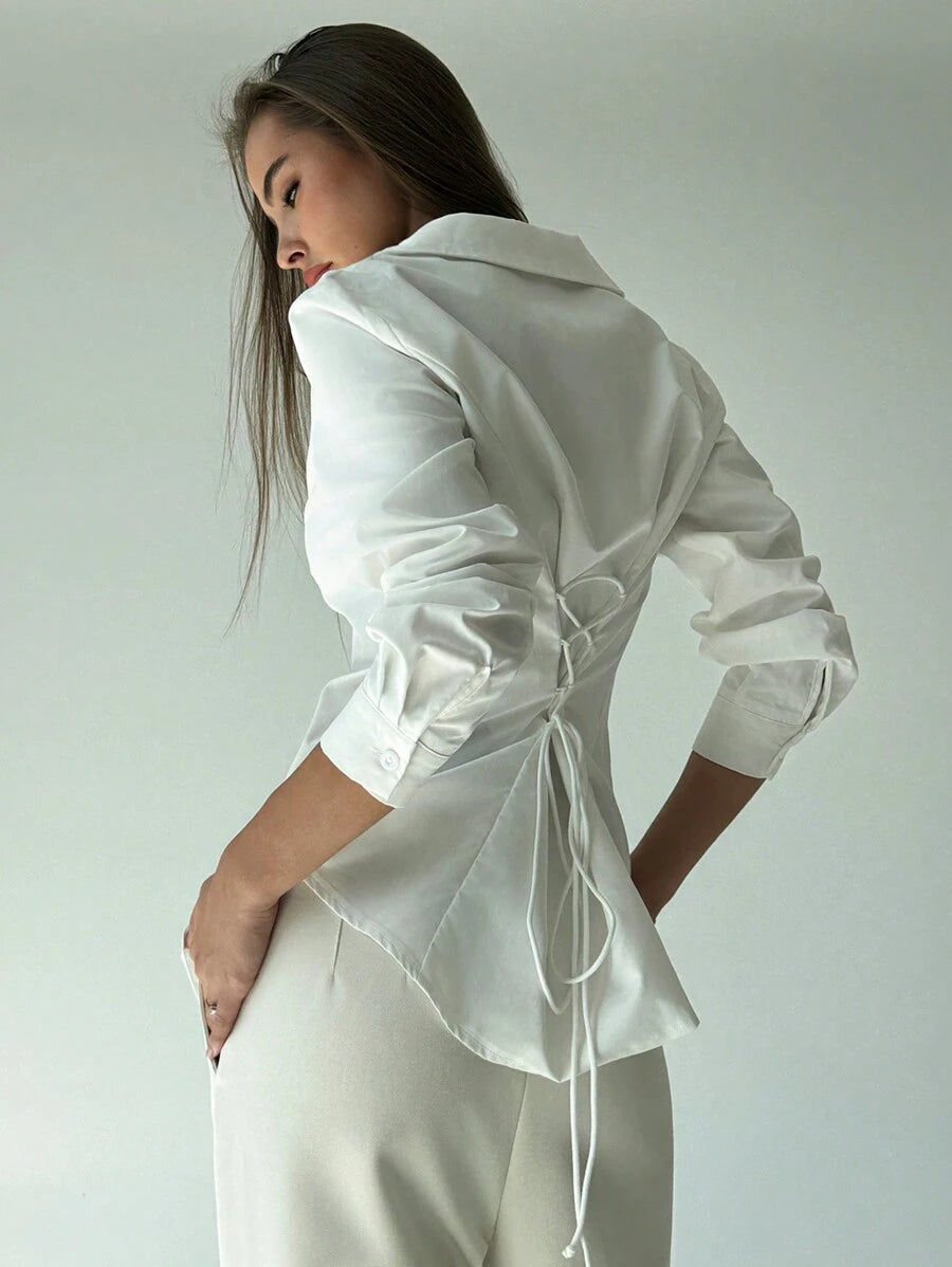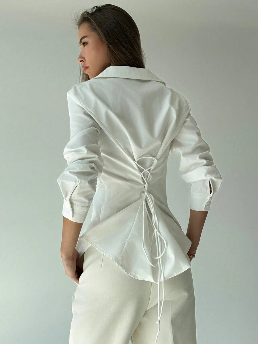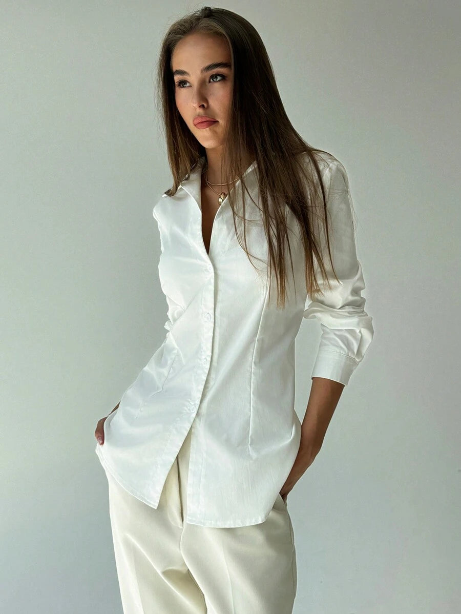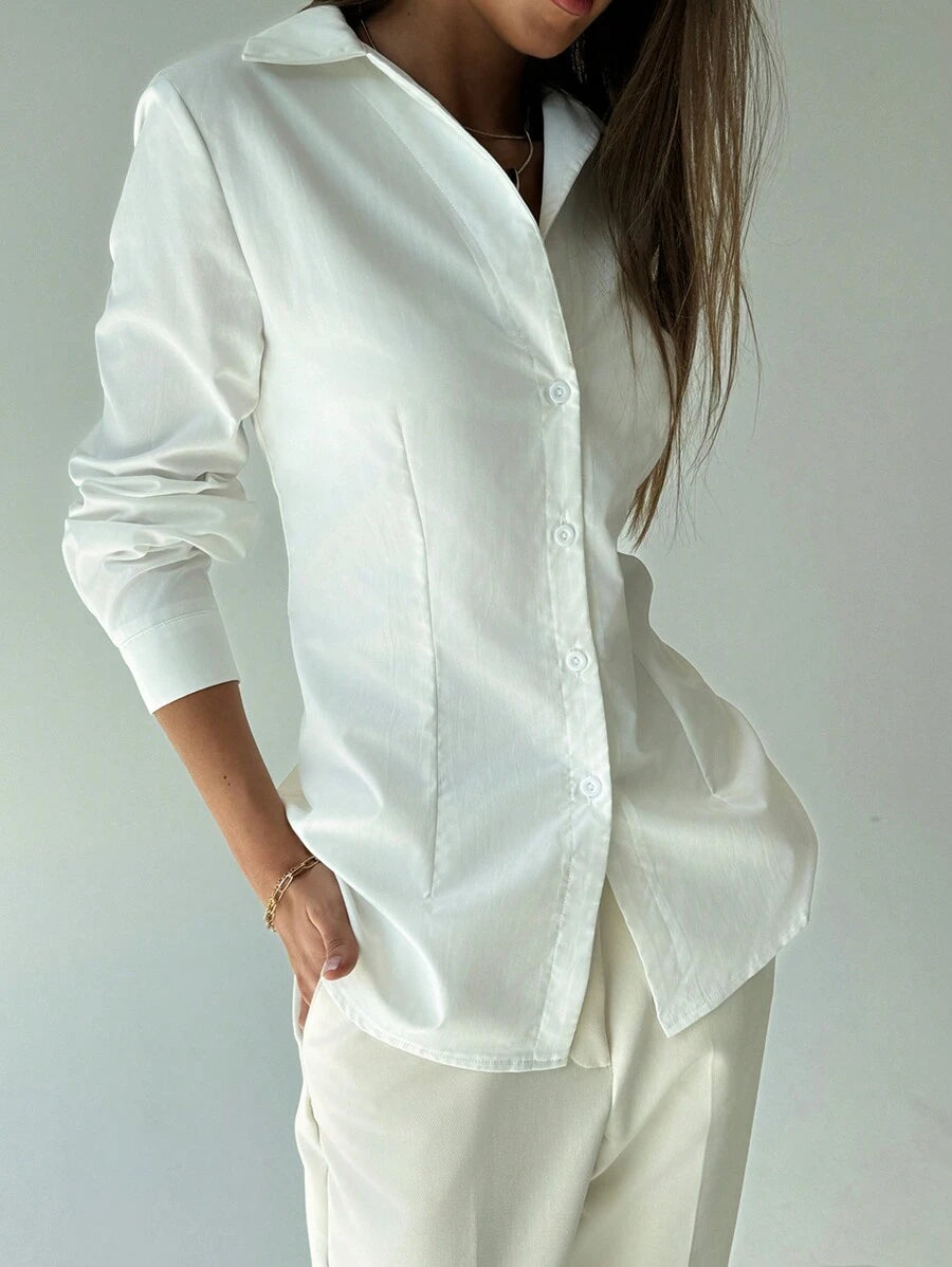 قميص كاجوال بأكمام طويلة وأزرار أمامية بتصميم جديد من Aloruh باللون الأبيض البسيط
