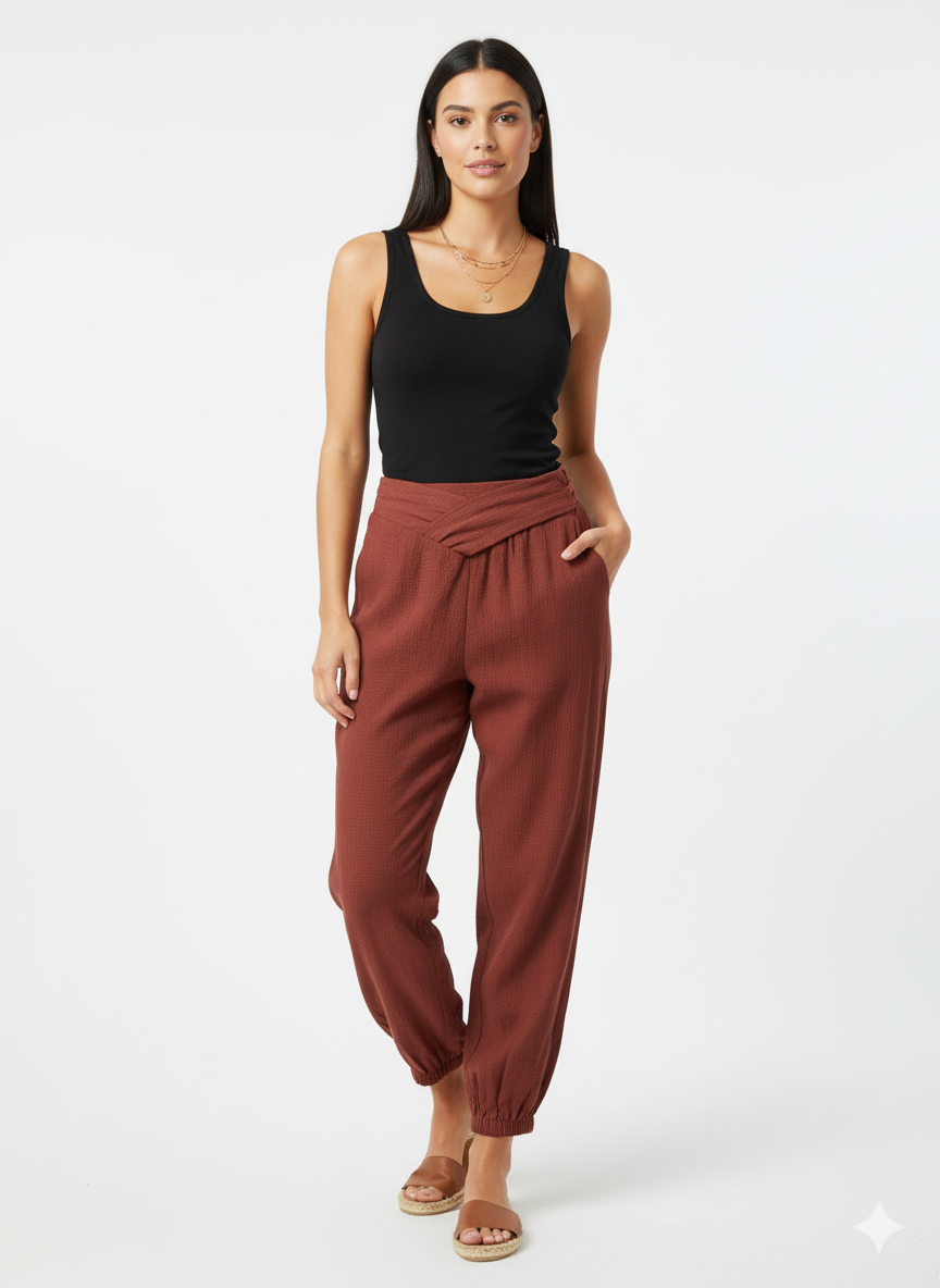 بنطال بقصّة مريحة وخامة خفيفة بملمس واضح، يظهر بشكل انسيابي على الجسم بدون أي مبالغة. التصميم يعتمد على وسط مرتفع مزود بتفصيلة ملتفّة تمنحه شكل لطيف وهادئ، مع أرجل واسعة تنتهي بجلد خفيف عند الكاحل لراحة أكبر. القطعة مناسبة للبس اليومي وتدي شكل مرتب وبسيط من غير تفاصيل زيادة.