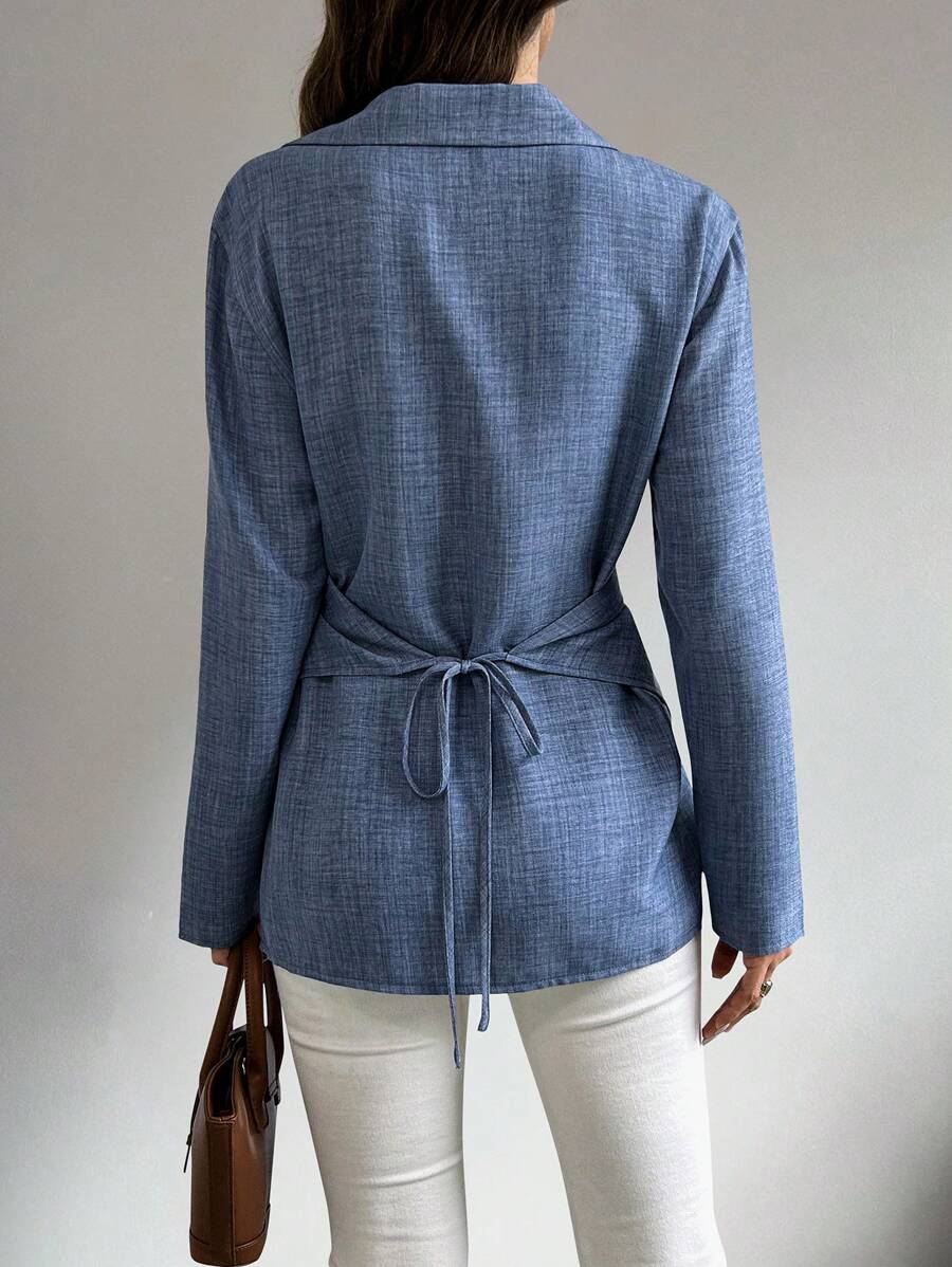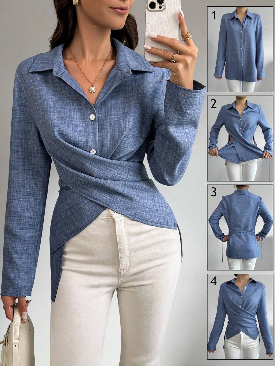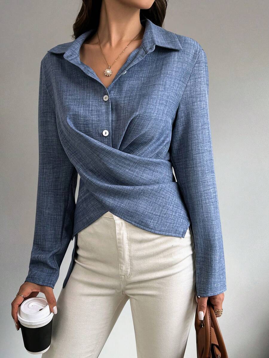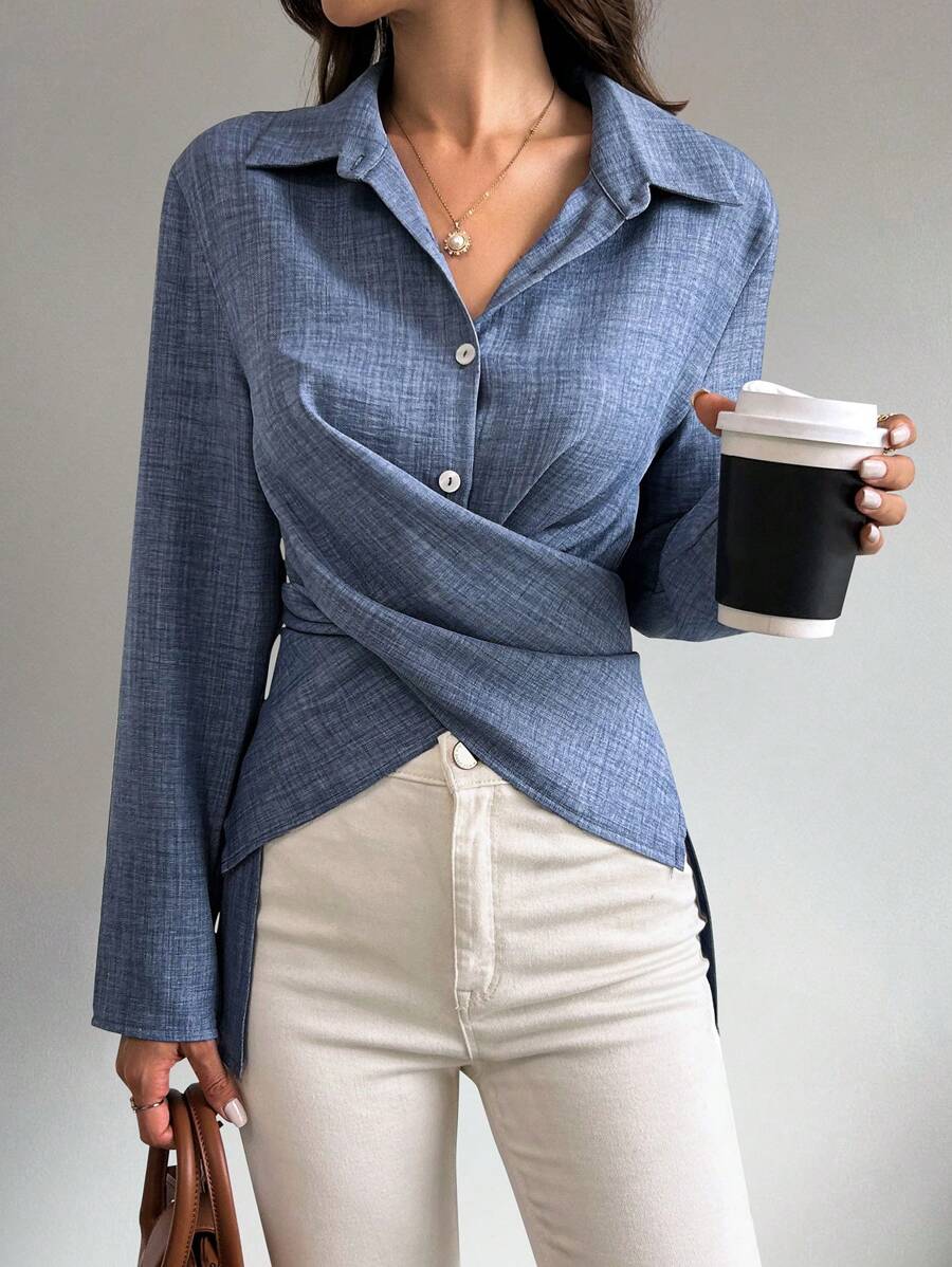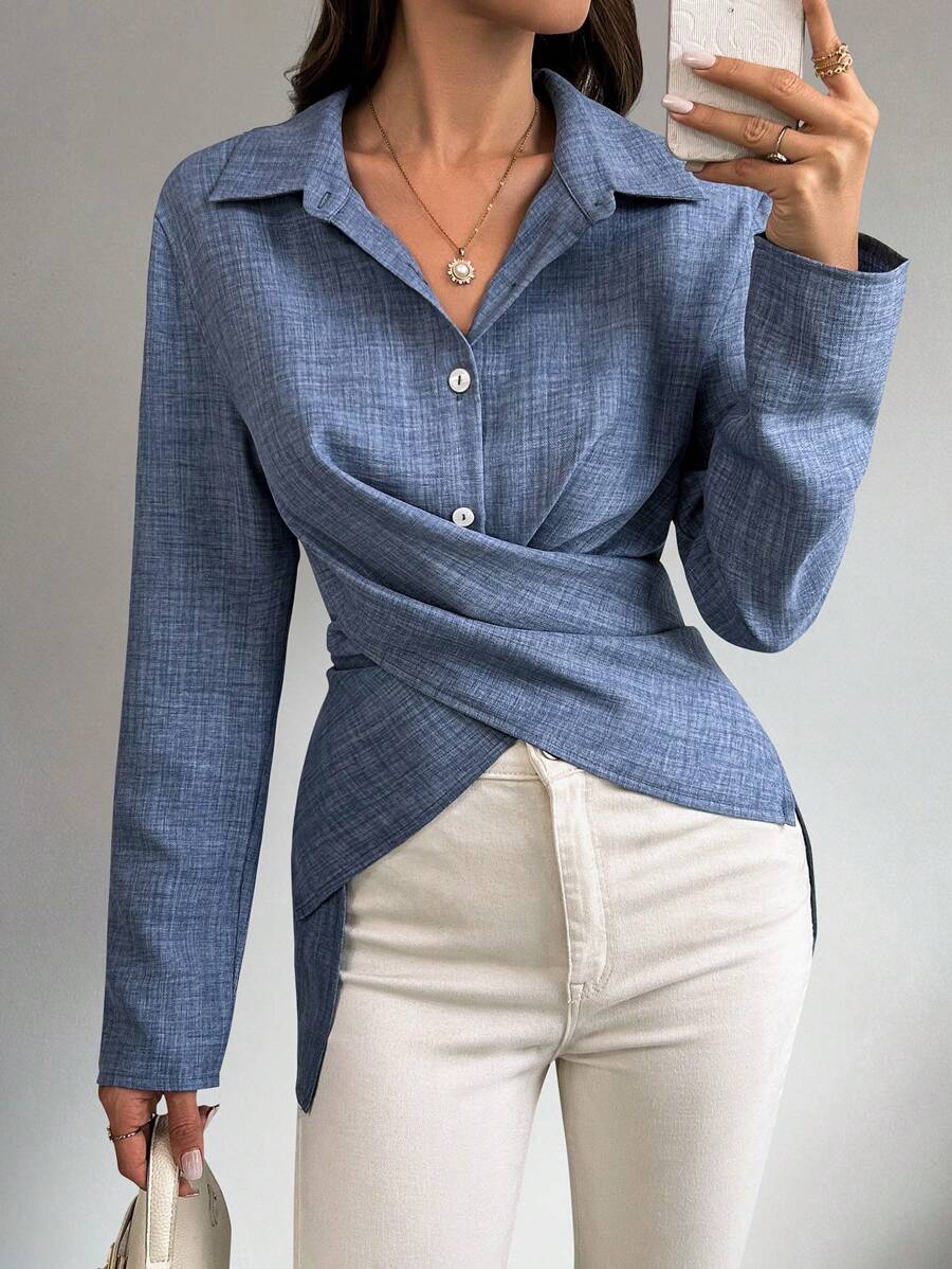 قميص شيكويز سادة متقاطع ملفوف، بلوزات بأكمام طويلة، قماش خريفي للنساء Shein