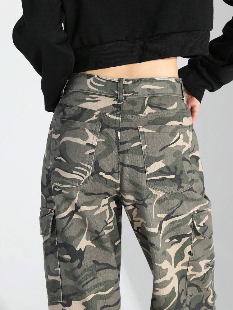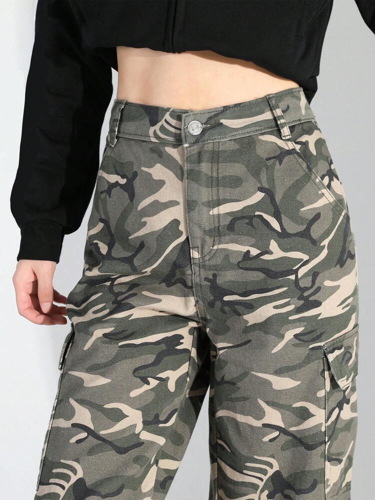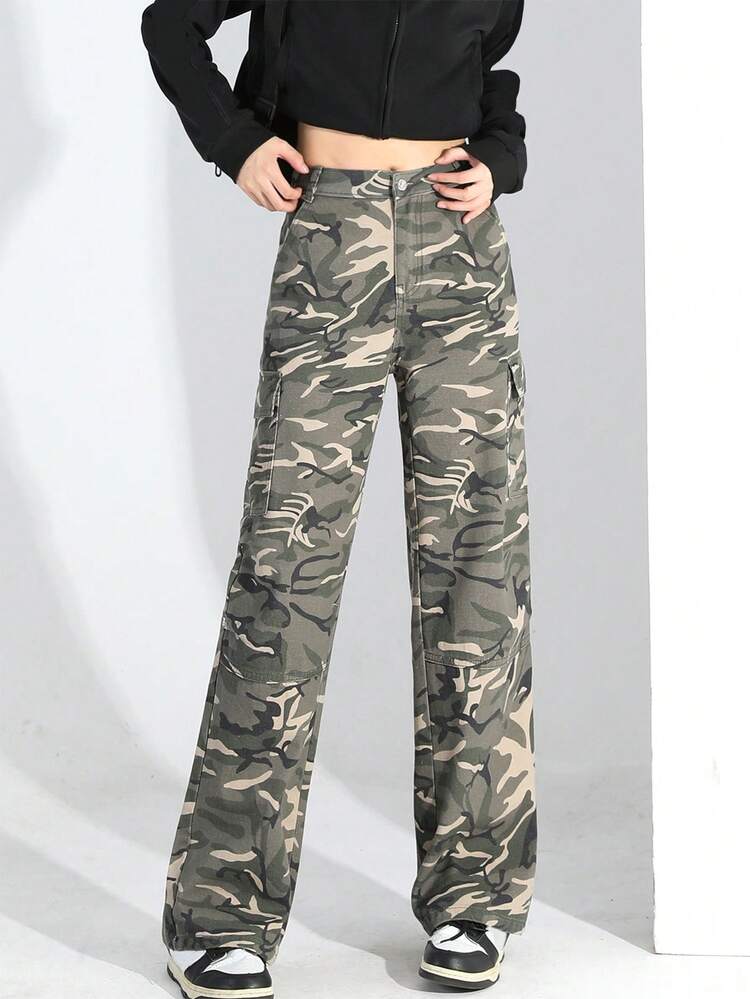 بنطلون جينز واسع الساق مريح بتصميم مموه عتيق للفتيات المراهقات