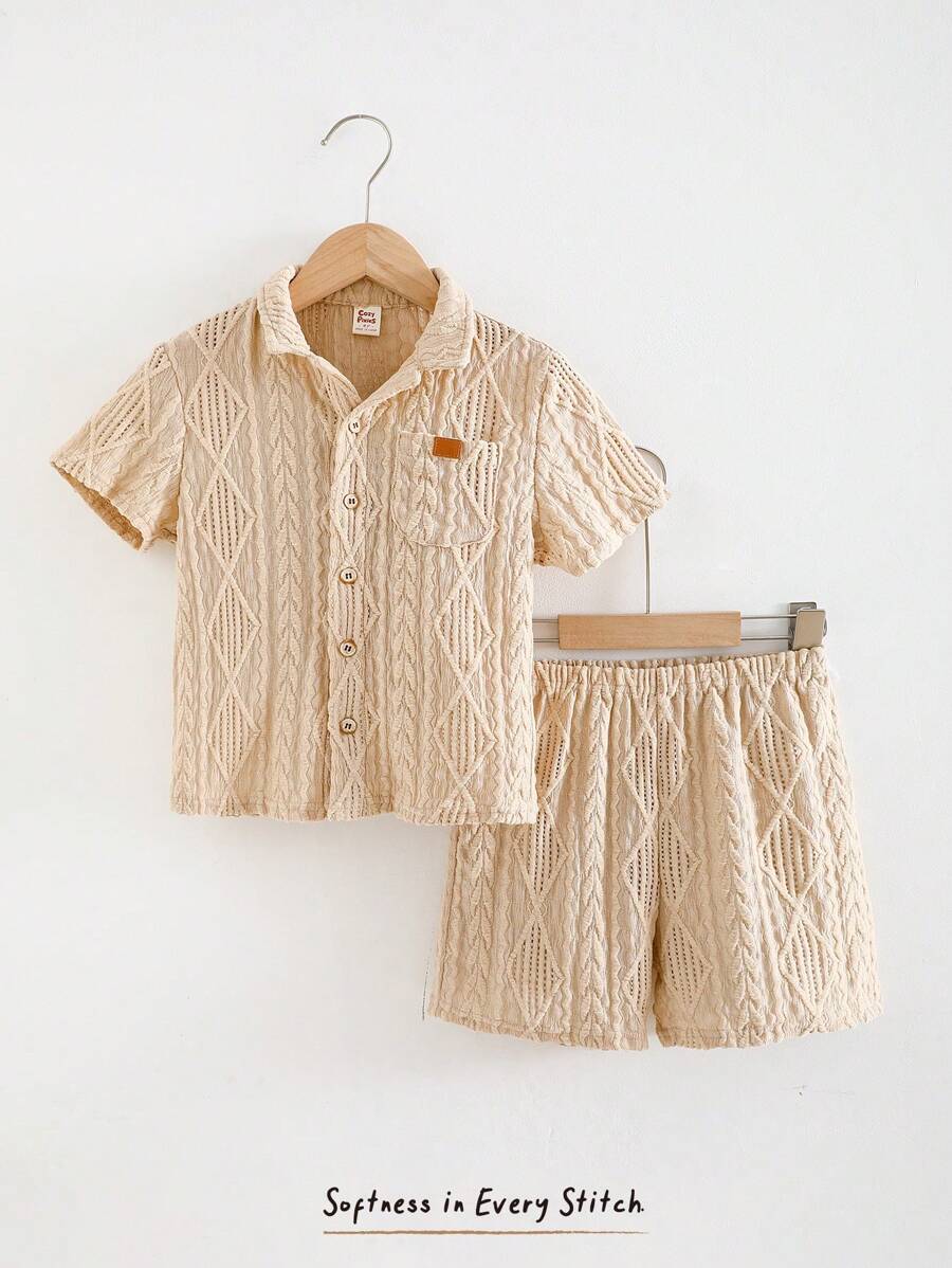 الطقم ده تصميمه بسيط ومريح، مخصوص للأولاد الصغار. التيشيرت بلون سادة وياقة بلون موحَّد، والشورت بخصر مطاطي لسهولة الحركة واللبس. القماش يكون خفيف وناعم، علشان يكون مناسب للّب اليومي وخروجات الصيف. التنسيق بتاعه عملي جدًا والاعتماد عليه سهل مع أي حذاء أو كوتشي.