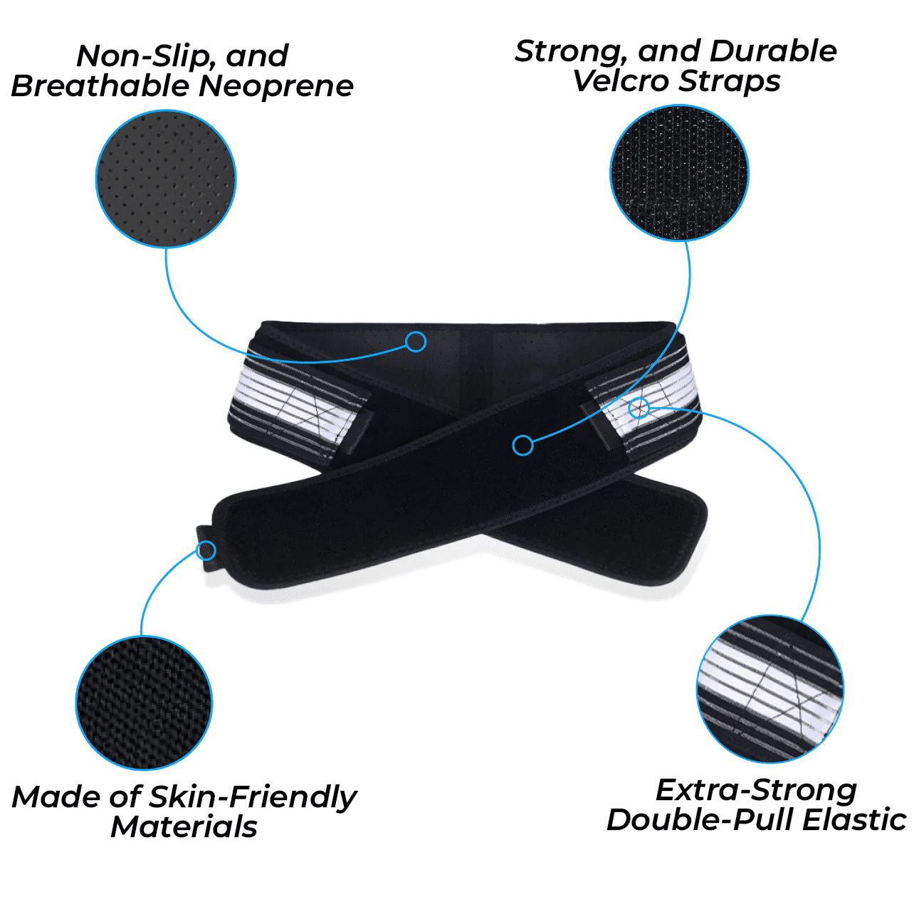 الحزام مصمم بتكوين داعم يساعد على تثبيت منطقة أسفل الظهر والورك بطريقة مريحة. خامته المرنة تسمح بالتحكم الجيد في مستوى الضغط، مع تصميم بسيط يسهل ارتداؤه لفترات طويلة. شكله النحيف يجعله مناسبًا للاستخدام اليومي دون أن يسبب إزعاج أثناء الحركة، ويمنح ثباتًا إضافيًا لمنطقة المفصل العجزي الحرقفي.