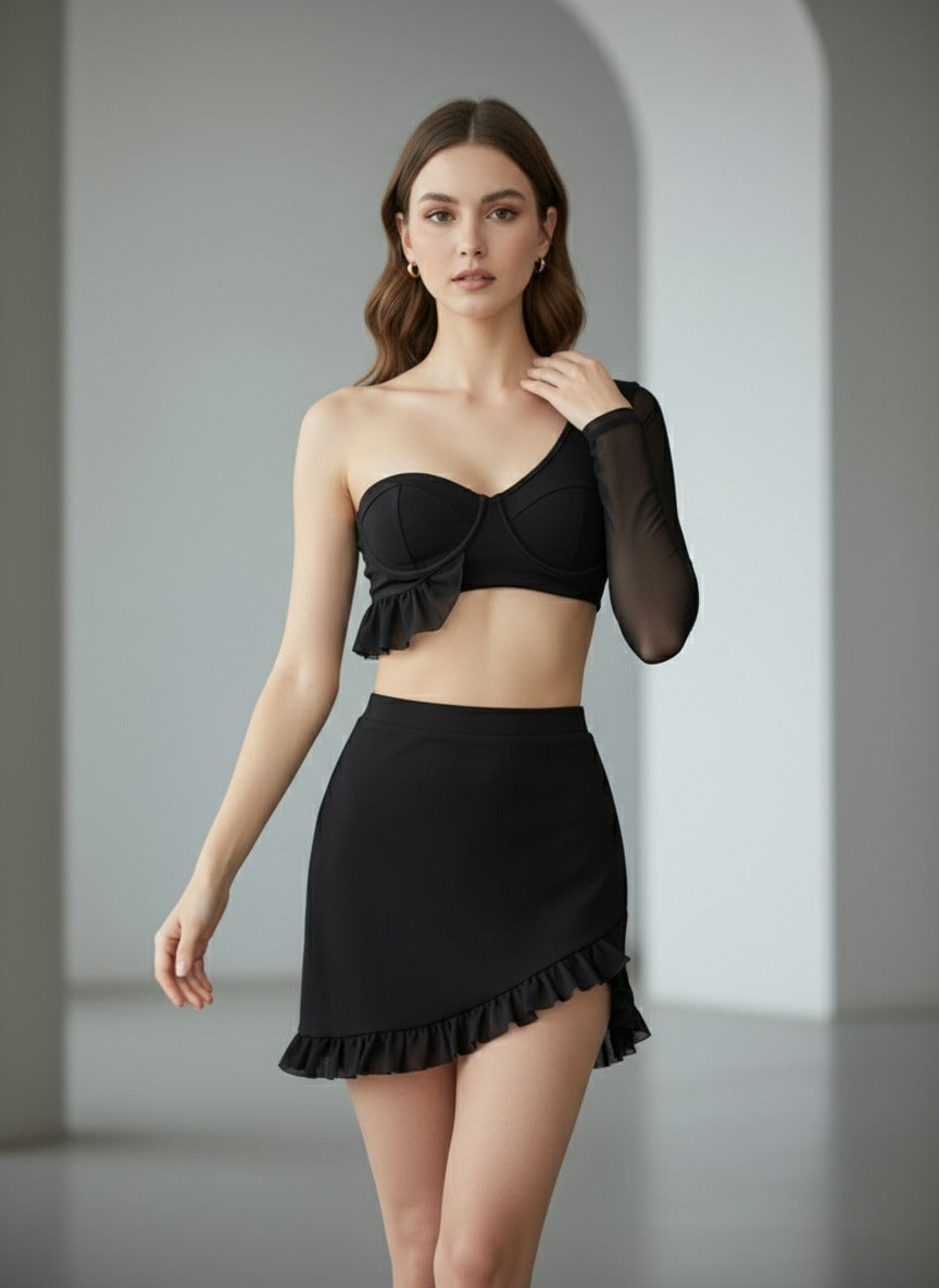 طقم عصري أنيق مكوّن من توب قصير بكم واحد شفاف وتنورة قصيرة بكشكش ناعم، يمنحك إطلالة أنثوية جريئة ومميزة للمناسبات والسهرات.