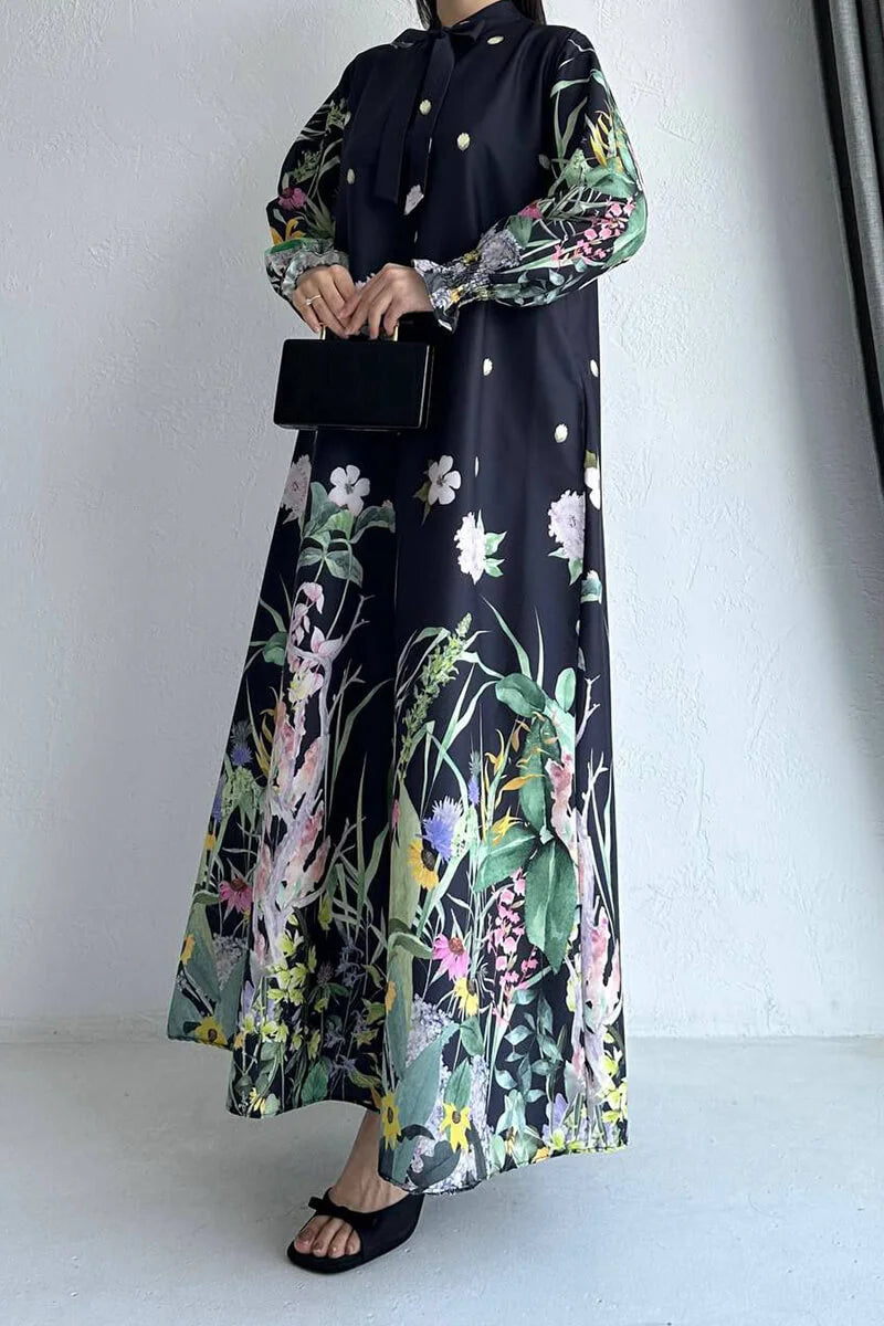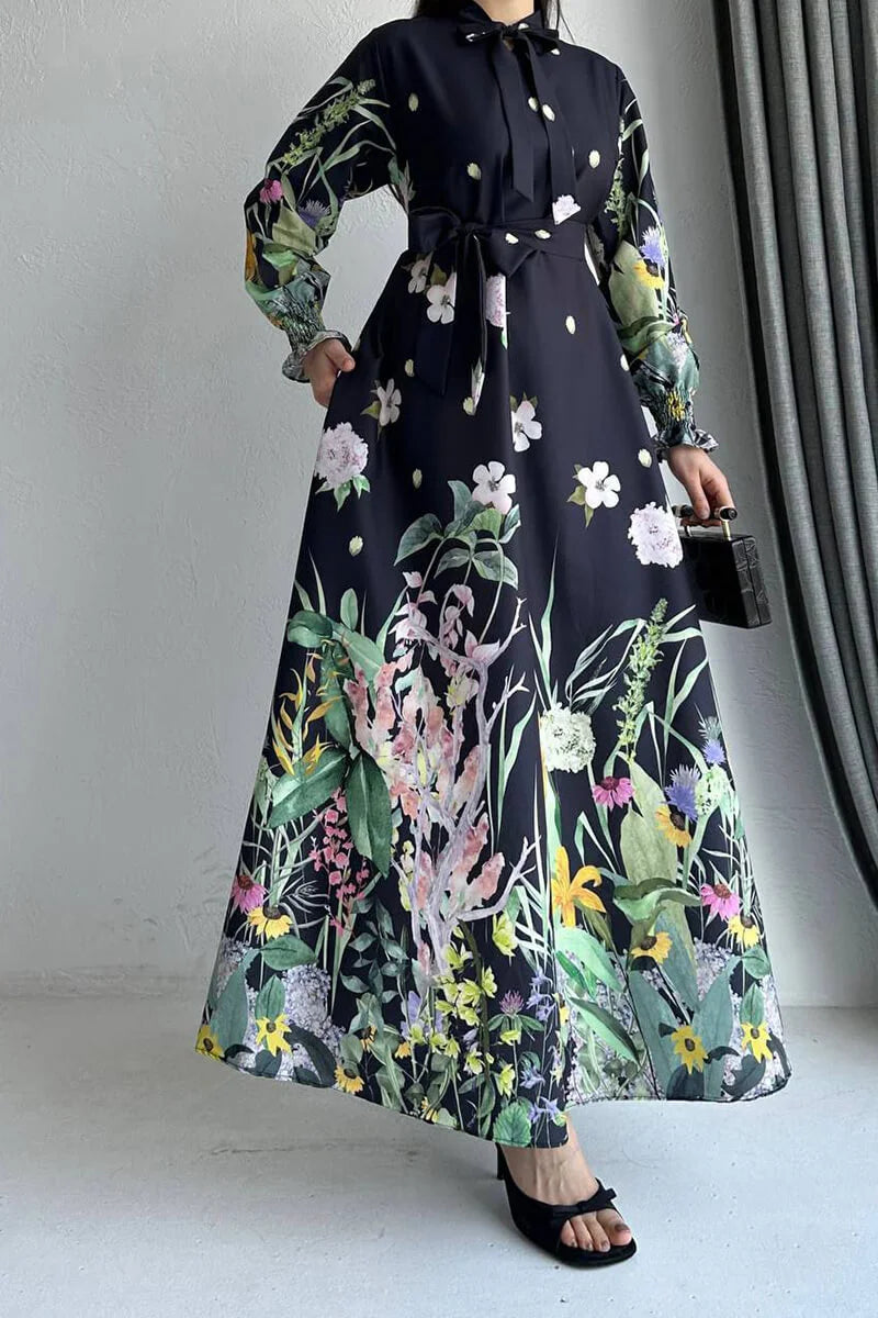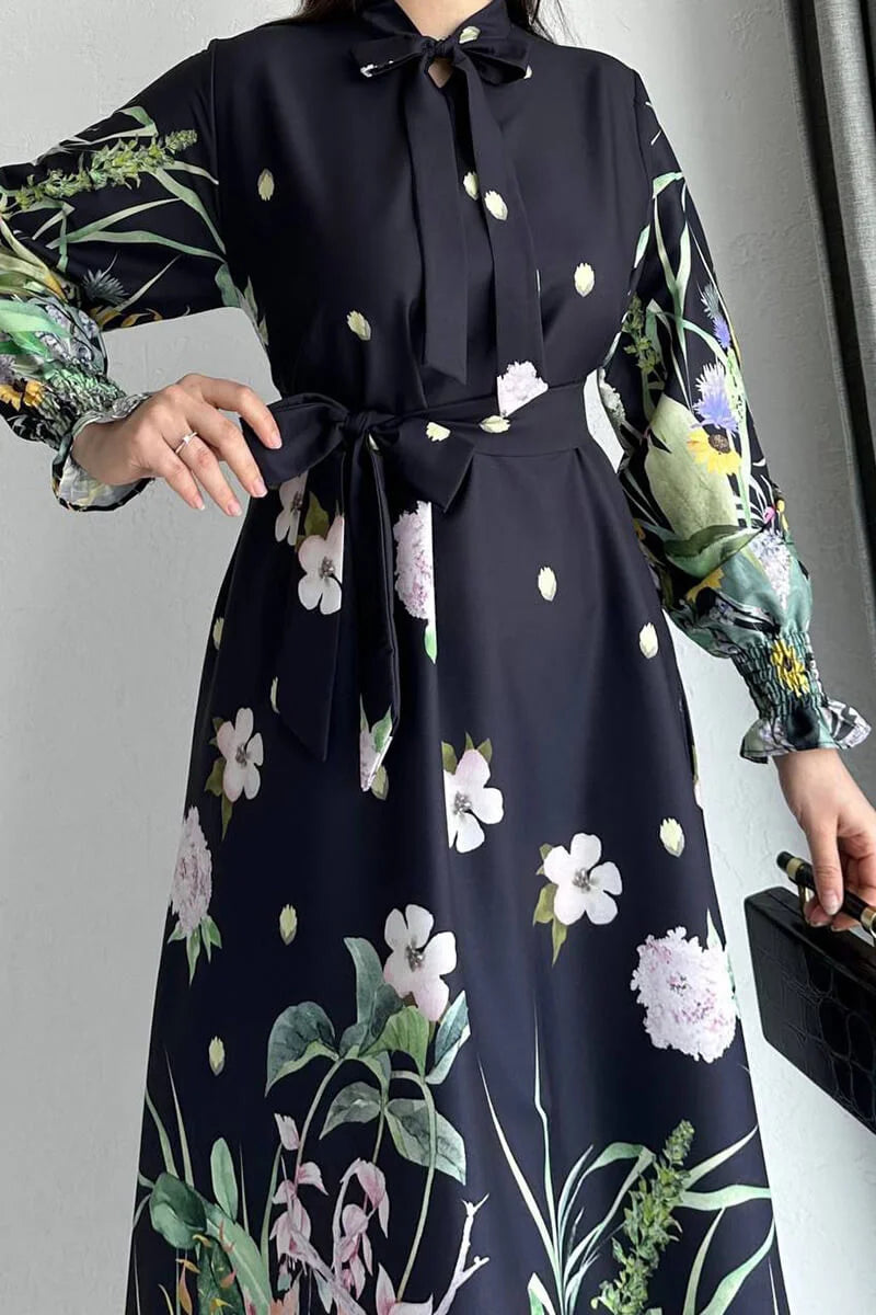 فستان أنيق بنقشة زهور مع رباط خصر وجيوب