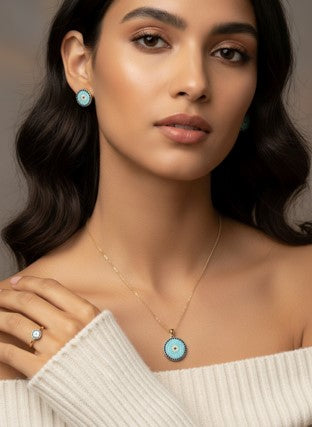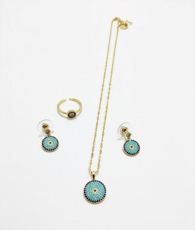 طقم مجوهرات أنيق بتصميم العين الزرقاء – عقد، أقراط وخاتم ذهبي