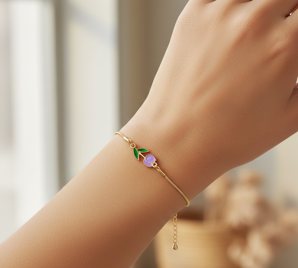 الإسورة بتجمع بين بساطة السلسلة الرفيعة ولون دهبي هادي بيدي شكل راقي من غير أي مبالغة. في منتصفها وردة صغيرة باللون البنفسجي مع ورقتين باللون الأخضر، وده بيضيف لمسة ناعمة وبسيطة للإيد. تصميمها خفيف ومريح في اللبس، ومناسبة للّبس اليومي أو لإضافة لمسة لطيفة لإطلالة بسيطة.