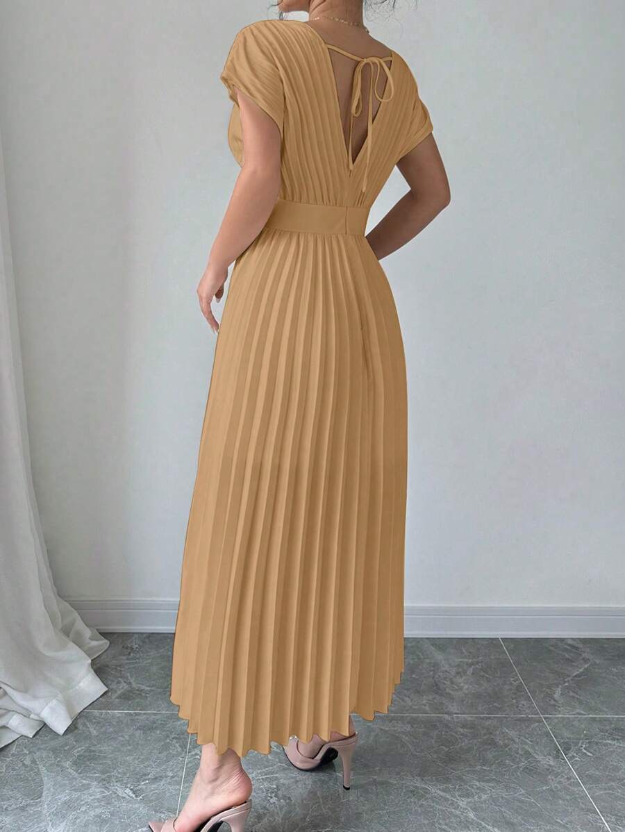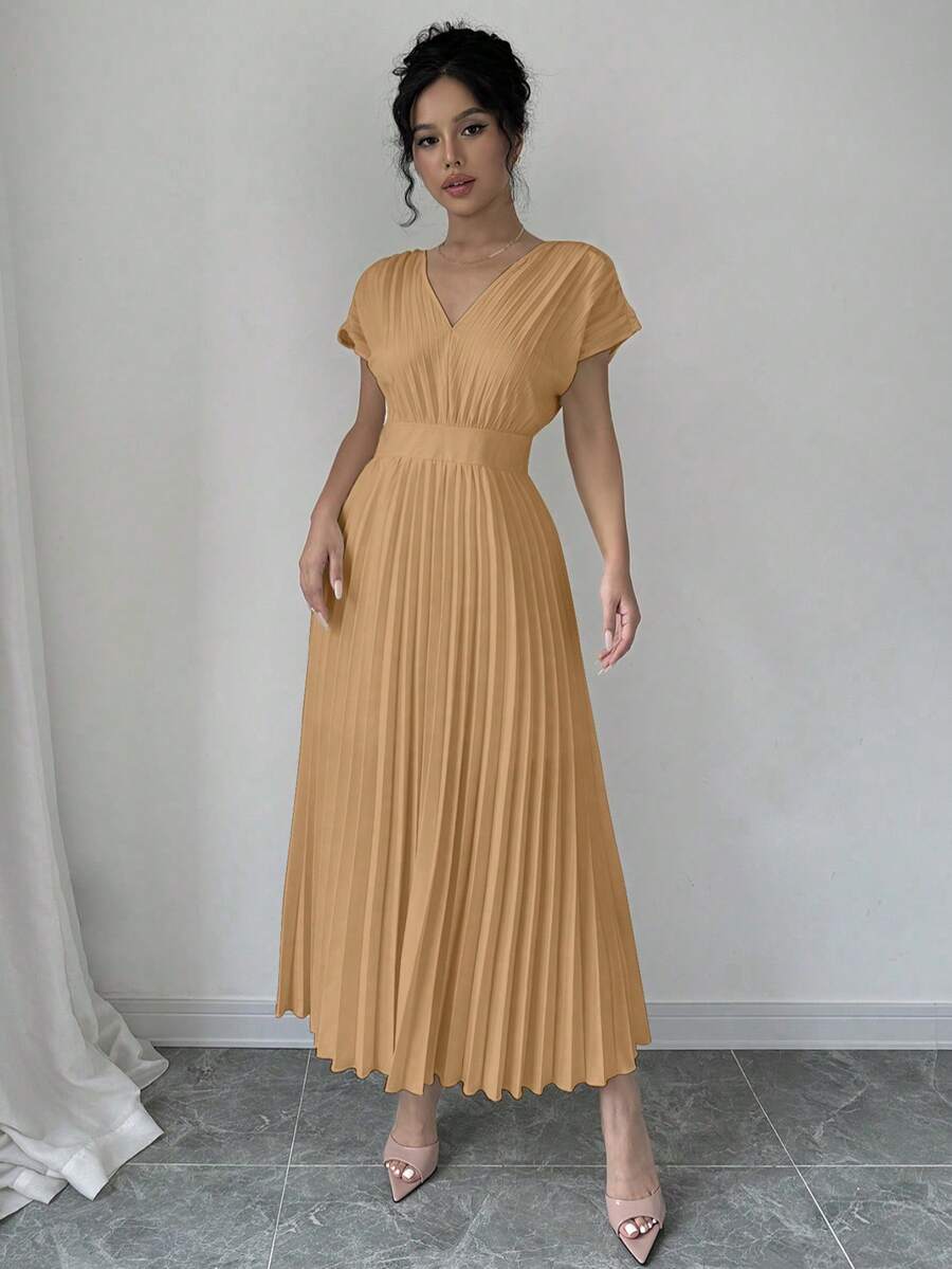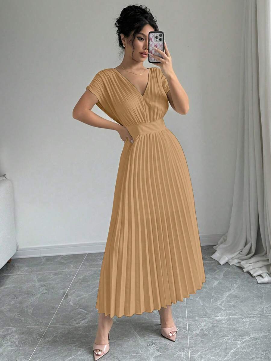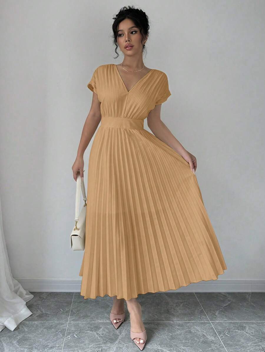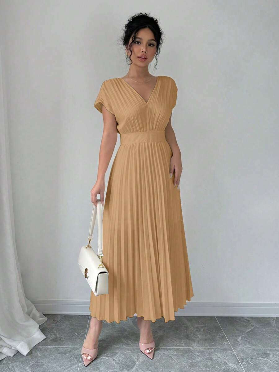 فستان إلينزجا النسائي الأنيق ذو اللون الموحد بدون أكمام وفتحة رقبة على شكل حرف V وخصر مشدود ومطويShein