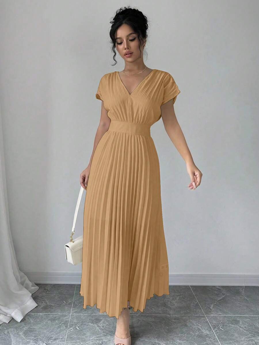 فستان متوسط الطول بتصميم بسيط وراقي يعتمد على الطيّات الناعمة التي تمنح الحركة شكلًا انسيابيًا وهادئًا. يأتي بفتحة رقبة V تضيف لمسة أنثوية بلا مبالغة، مع خصر محدد يظهر القوام بشكل مرتب وطبيعي. خامته خفيفة ومناسبة للإطلالات اليومية أو المناسبات البسيطة.