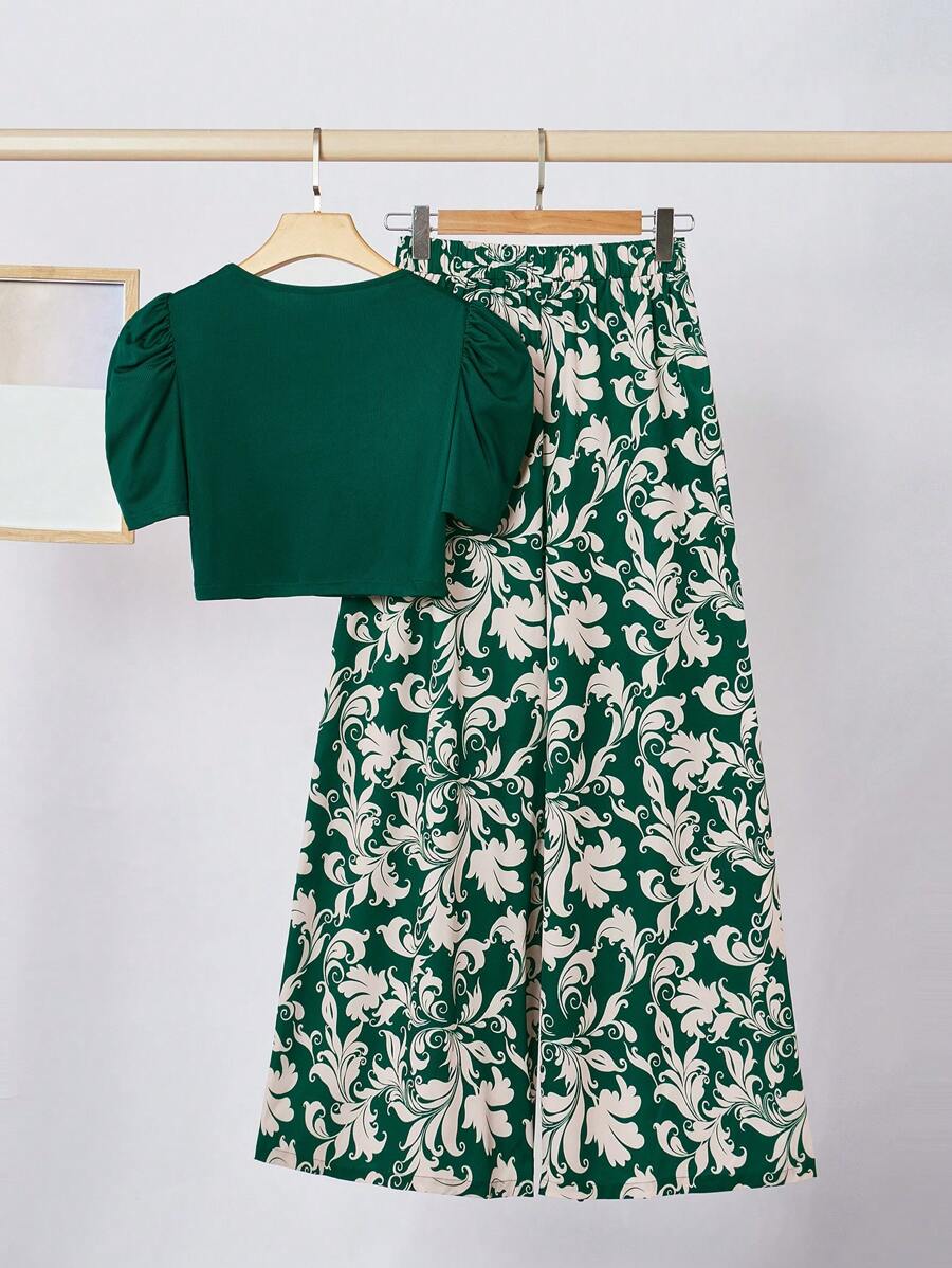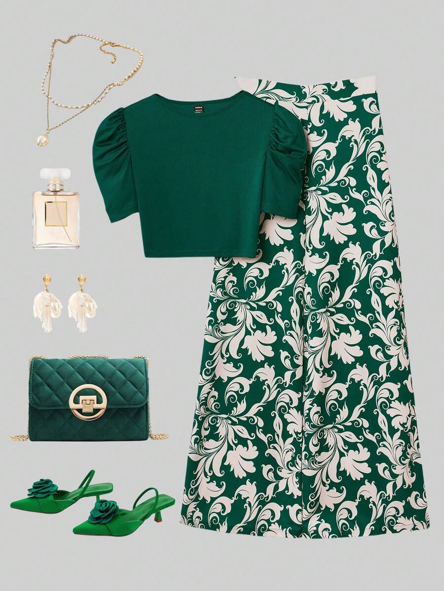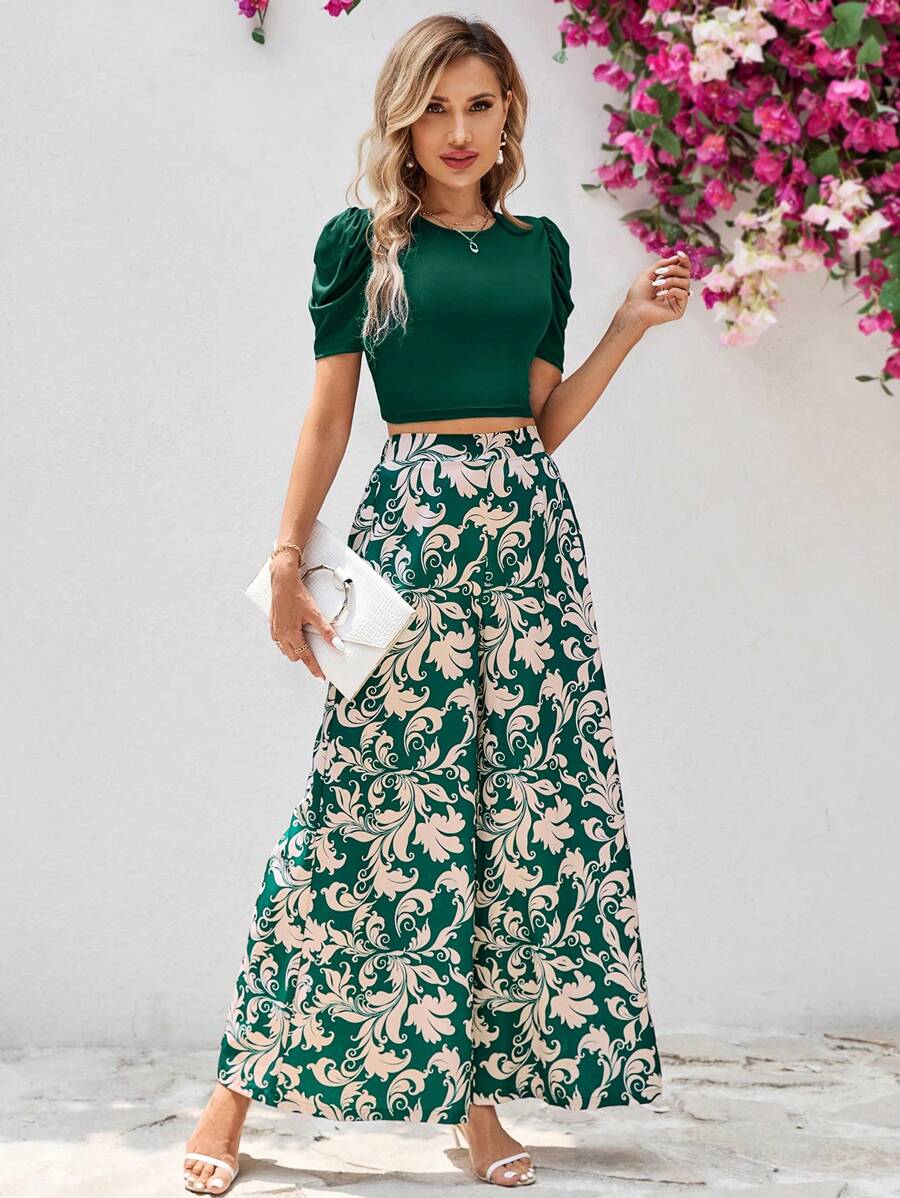 طقم أنثوي أنيق مكون من بلوزة قصيرة باللون الأخضر الغامق وبنطلون واسع بنقشة فخمة
