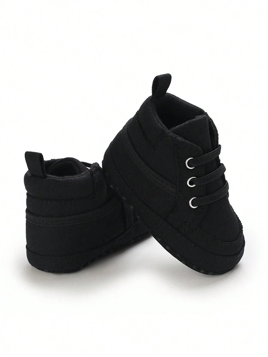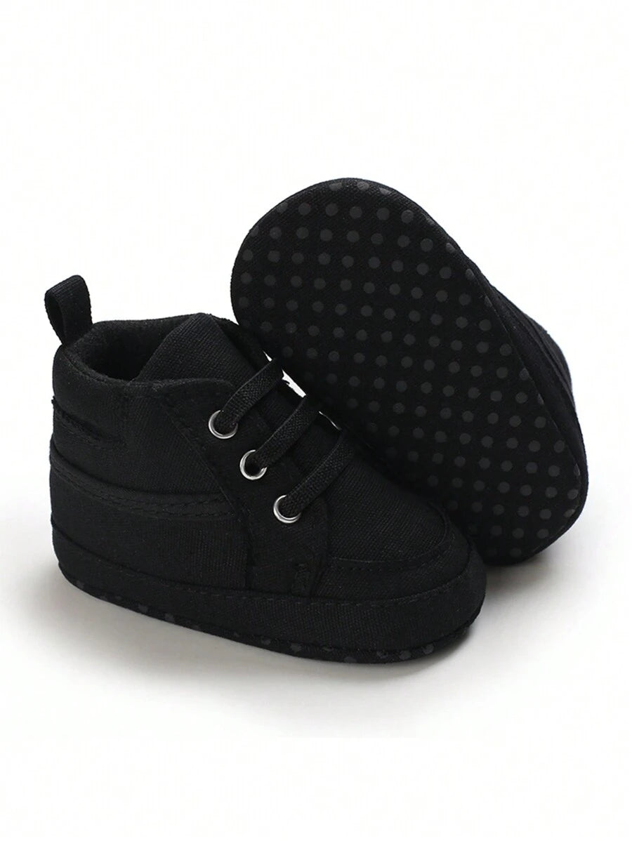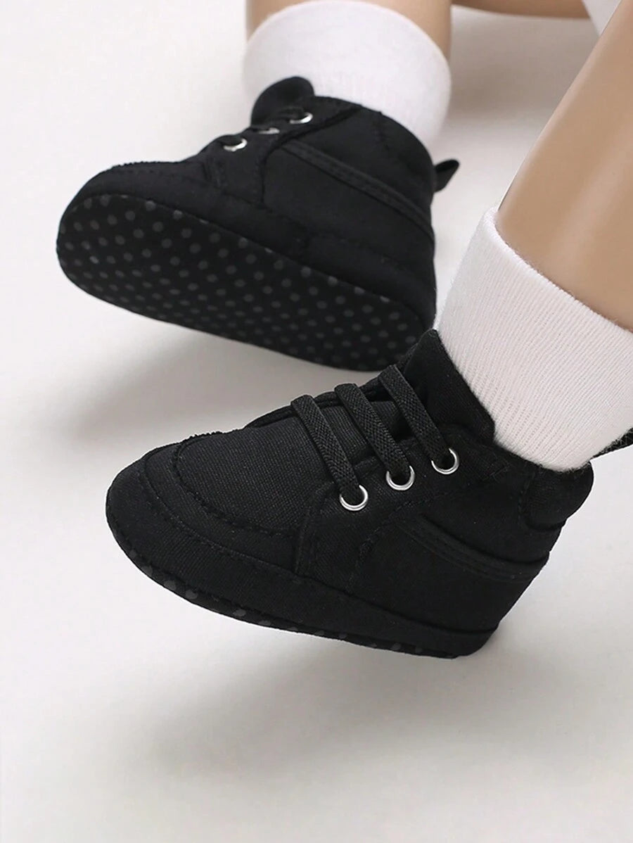 حذاء أطفال أنيق ومريح باللون الأسود، مناسب للأولاد والبنات في سنواتهم الأولى. تصميمه مصنوع من خامة قماشية ناعمة وخفيفة لتوفير الراحة أثناء الارتداء، مع رباط أمامي لتثبيت جيد وسهولة اللبس. النعل السفلي مرن ومبطن بنقاط مانعة للانزلاق لتوفير ثبات وأمان أثناء الحركة.