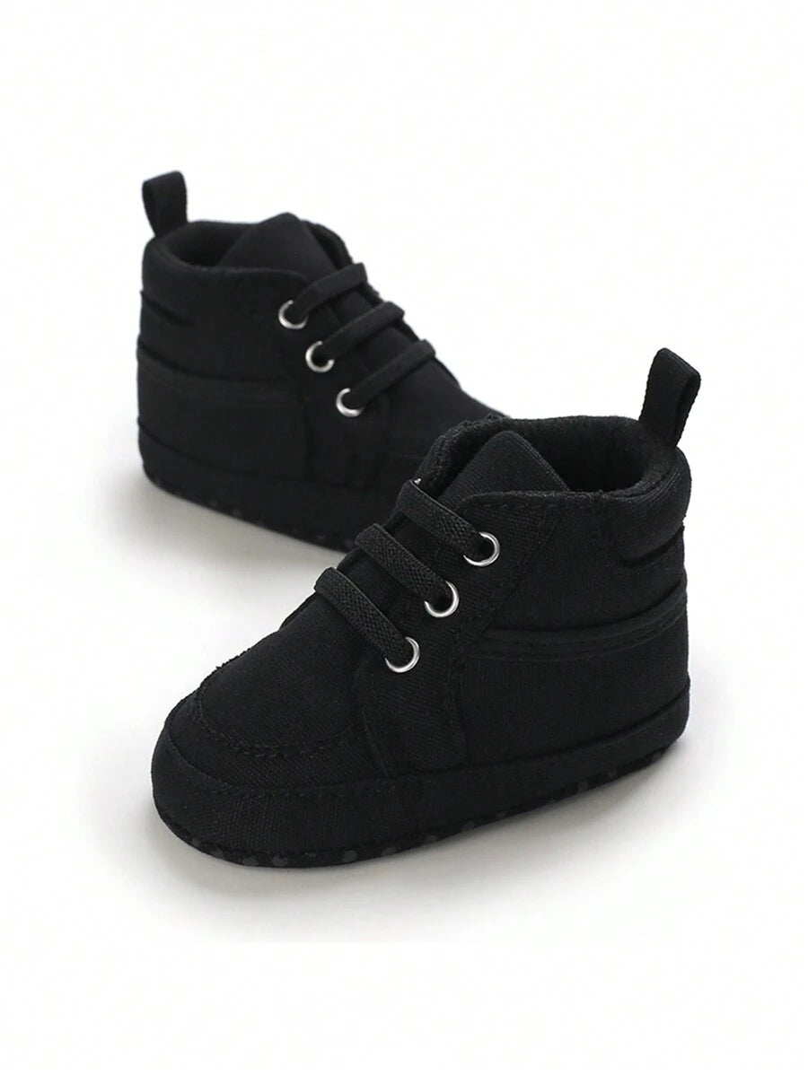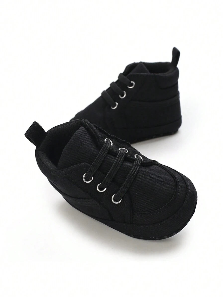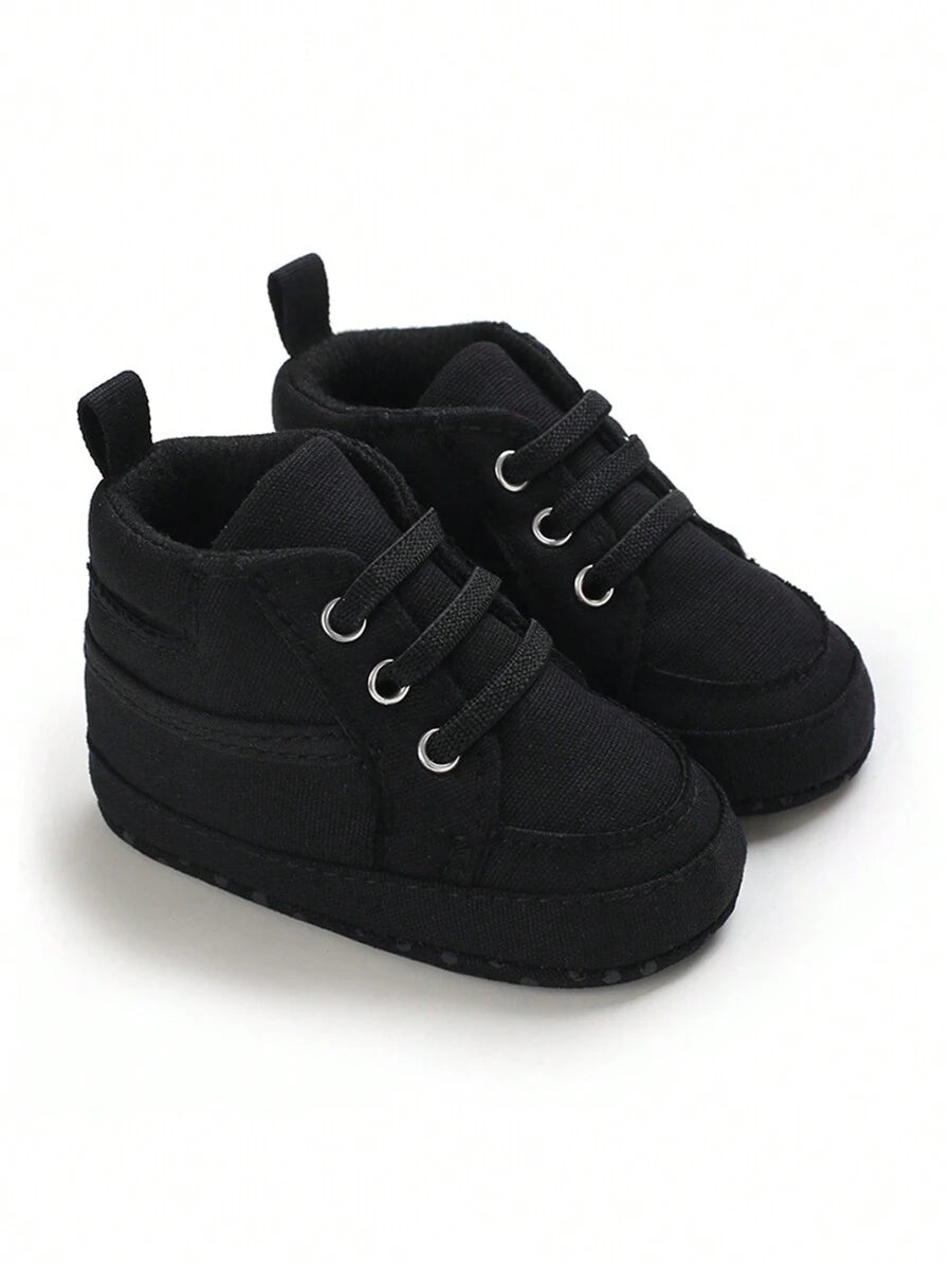 حذاء أطفال أنيق ومريح باللون الأسود، مناسب للأولاد والبنات في سنواتهم الأولى. تصميمه مصنوع من خامة قماشية ناعمة وخفيفة لتوفير الراحة أثناء الارتداء، مع رباط أمامي لتثبيت جيد وسهولة اللبس. النعل السفلي مرن ومبطن بنقاط مانعة للانزلاق لتوفير ثبات وأمان أثناء الحركة.
