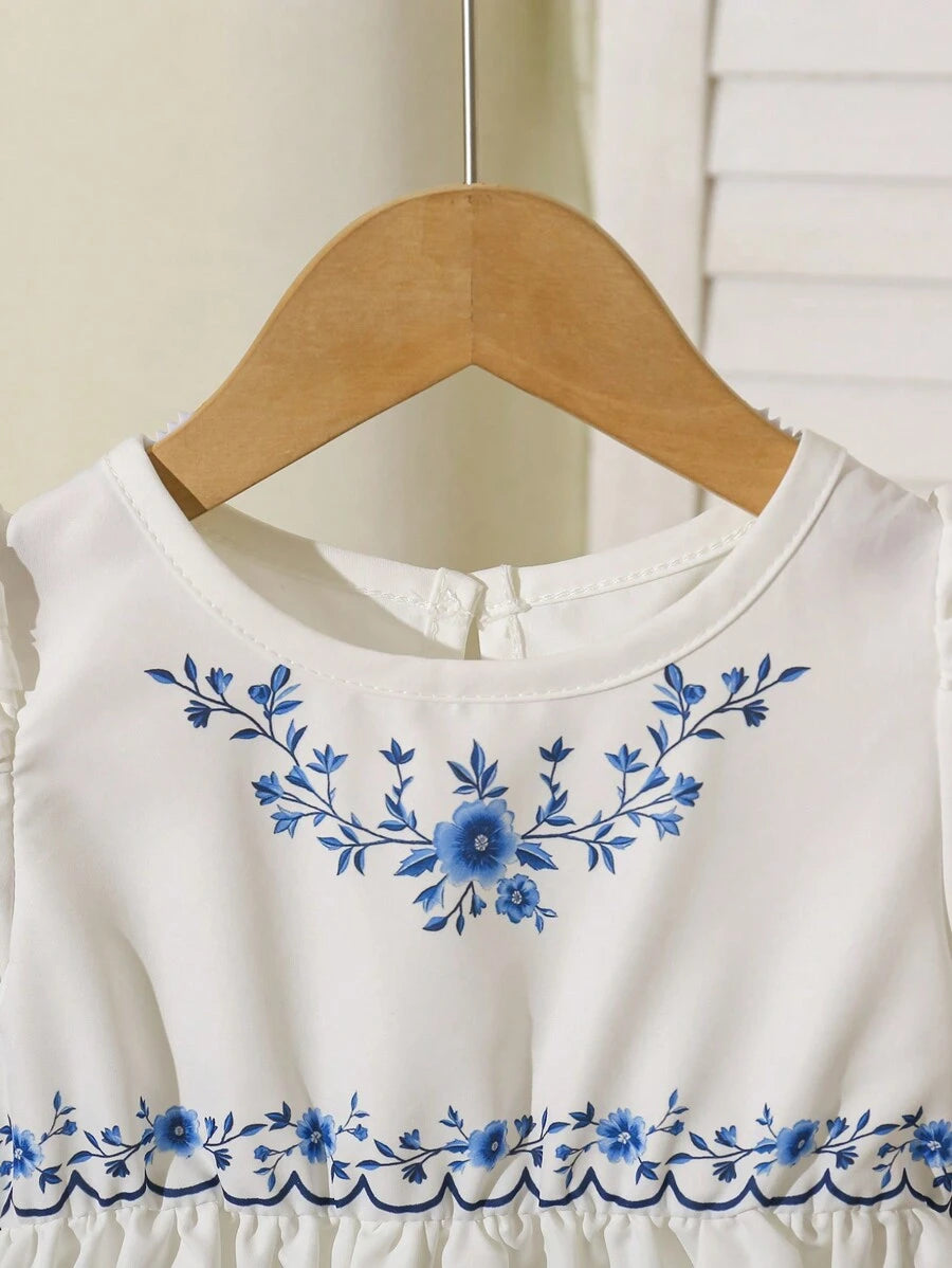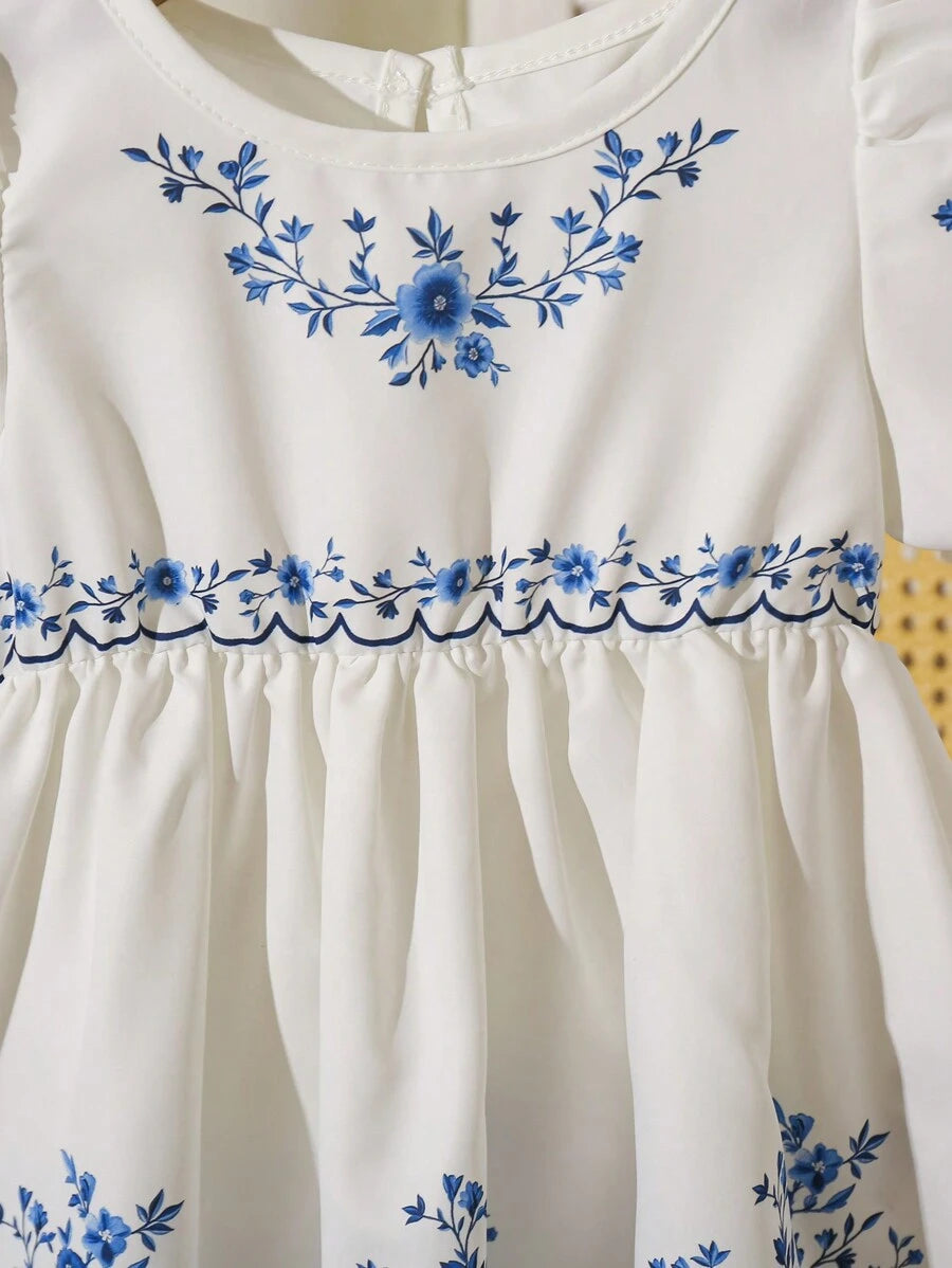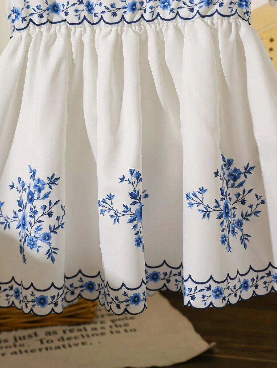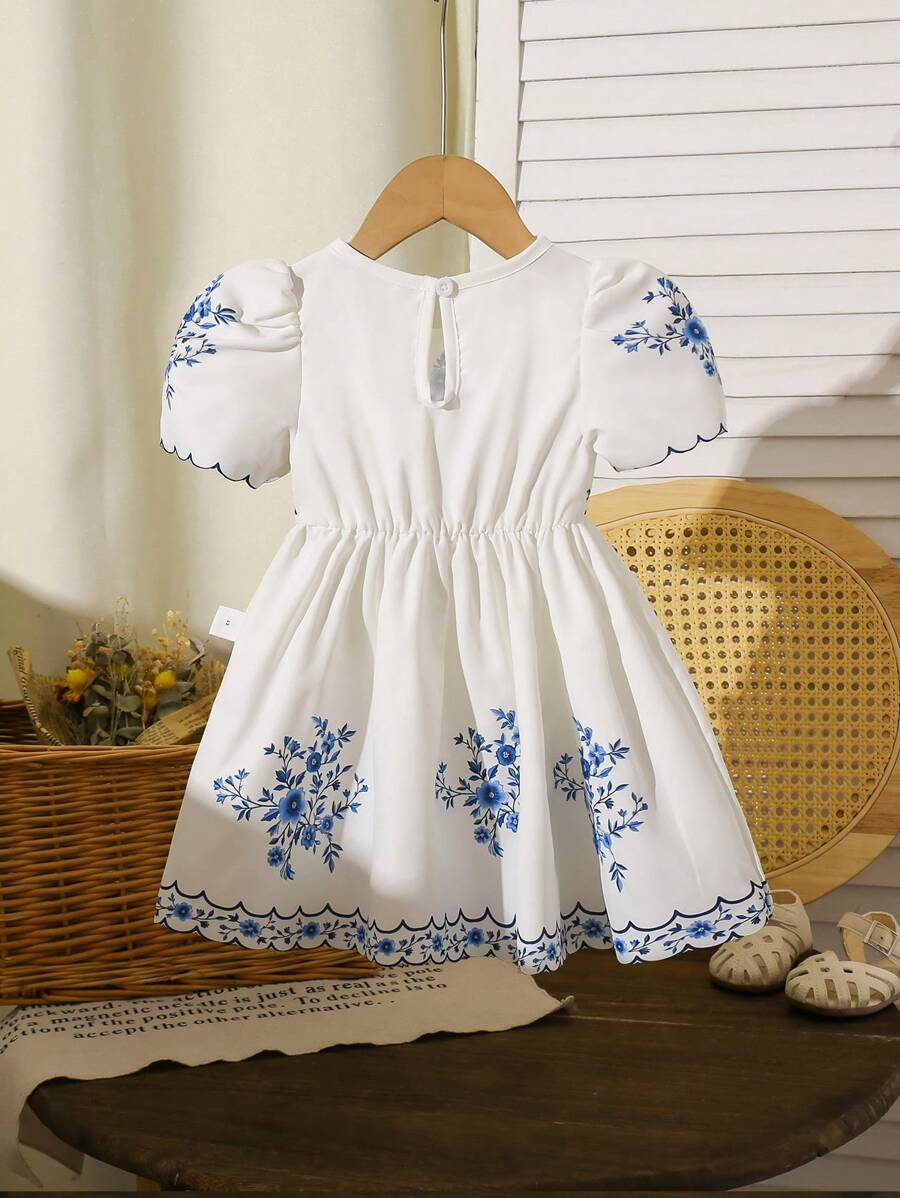 فستان بناتي من شي ان – أزرق وأبيض، أكمام منتفخة
