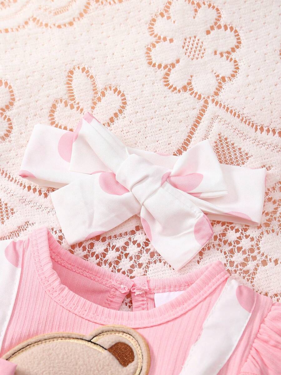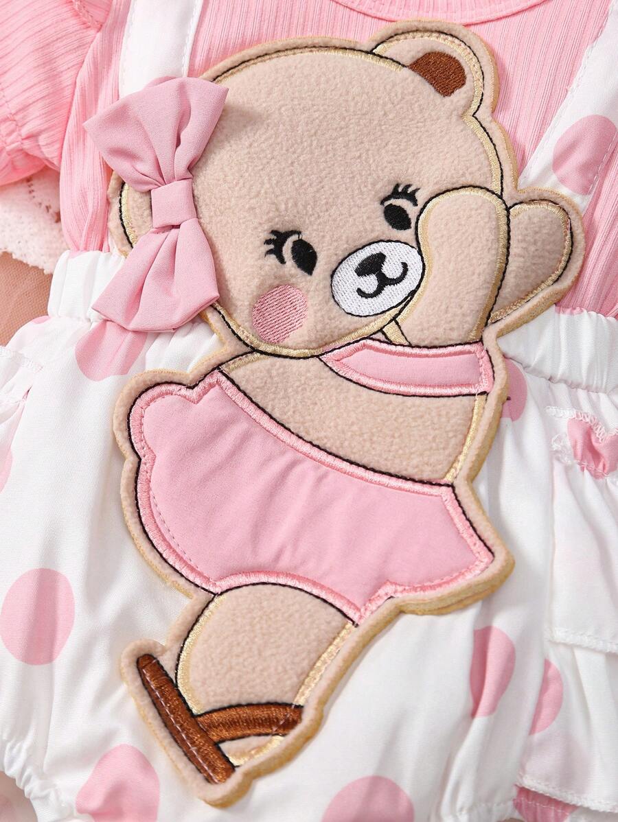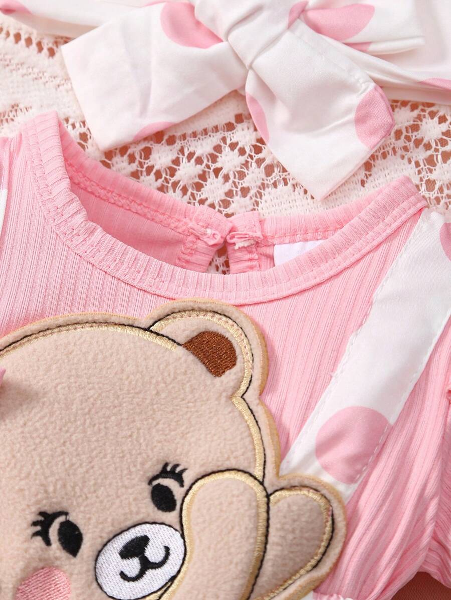 طقم بناتي مكوّن من بلوزة وردية قصيرة الأكمام وأفرول أبيض بنقاط بولكا وردية مزين بتطريز دب كرتوني في المنتصف. الأفرول مزود بطبقات خفيفة على الجانبين تضيف شكل بسيط للتصميم، ويأتي مع عصابة رأس مطبوعة بنفس النقشة. القطع مصنوعة من خامات قطنية خفيفة ومناسبة لملابس الأطفال اليومية أو المناسبات العادية