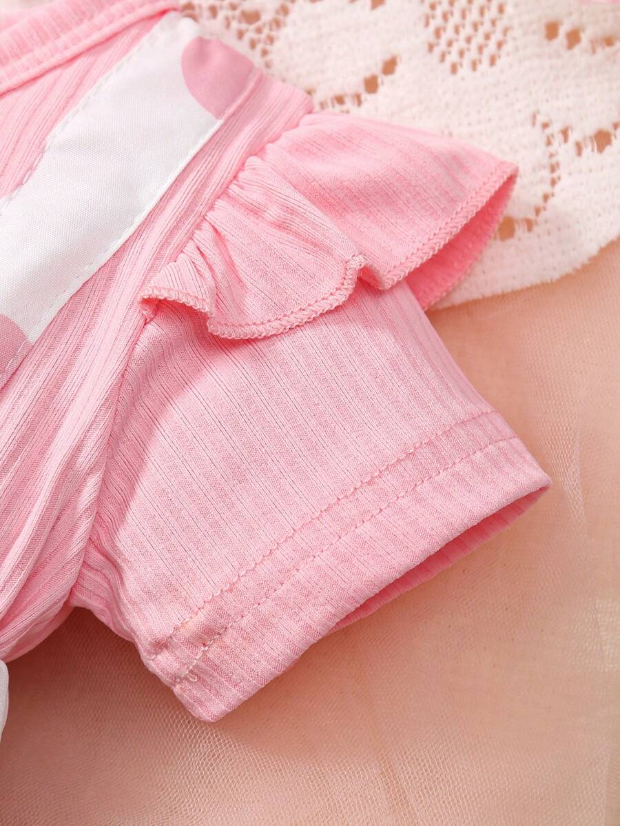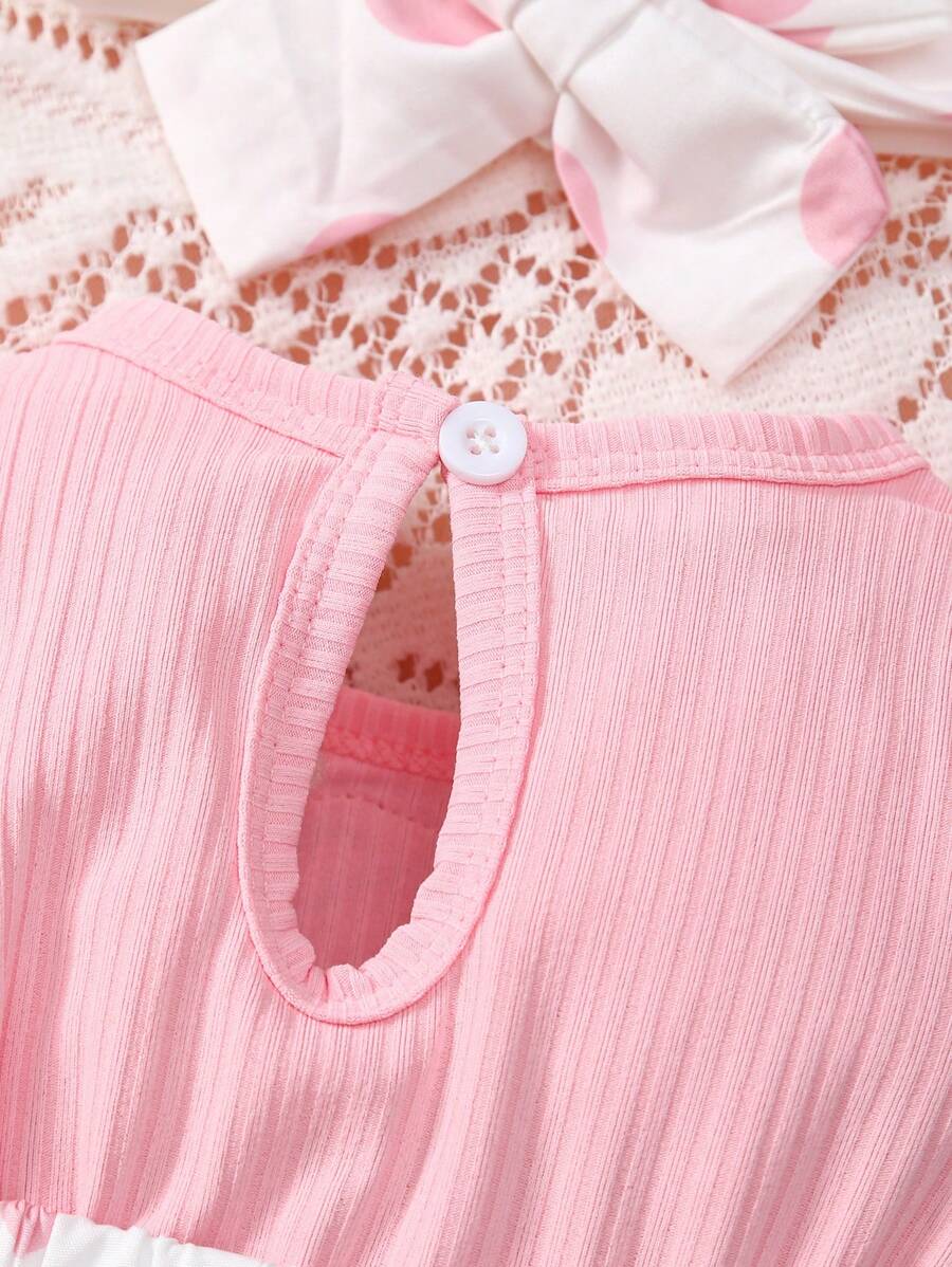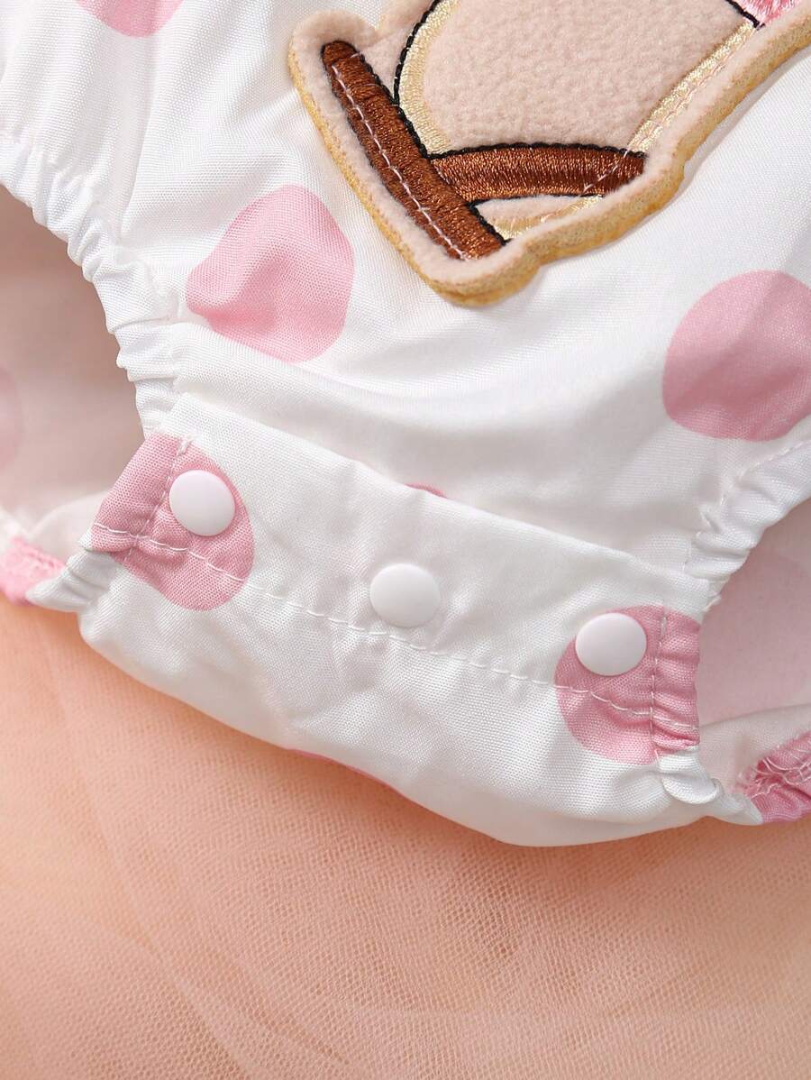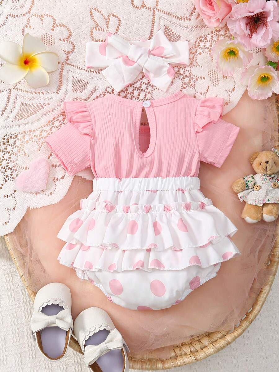 طقم بناتي مكوّن من بلوزة وردية قصيرة الأكمام وأفرول أبيض بنقاط بولكا وردية مزين بتطريز دب كرتوني في المنتصف. الأفرول مزود بطبقات خفيفة على الجانبين تضيف شكل بسيط للتصميم، ويأتي مع عصابة رأس مطبوعة بنفس النقشة. القطع مصنوعة من خامات قطنية خفيفة ومناسبة لملابس الأطفال اليومية أو المناسبات العادية