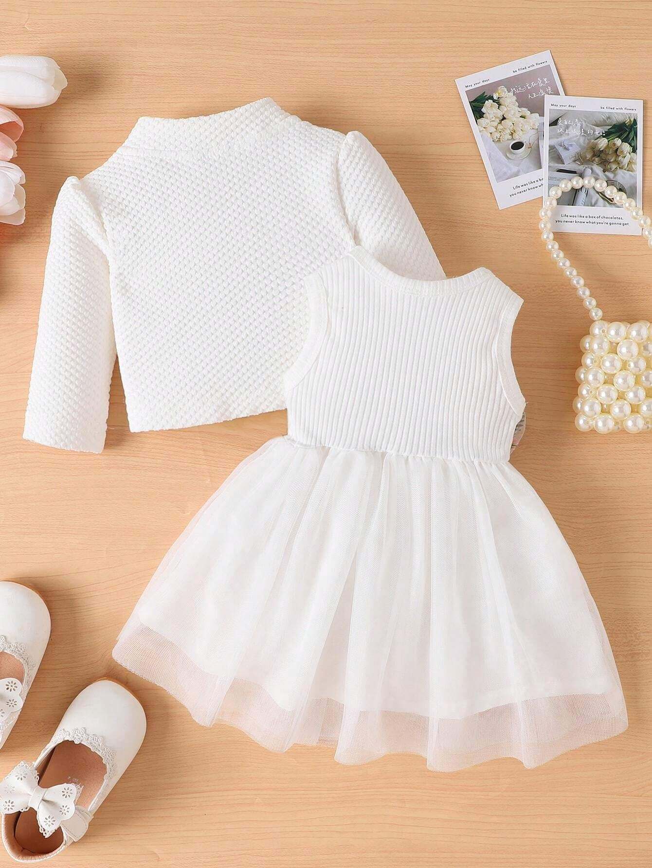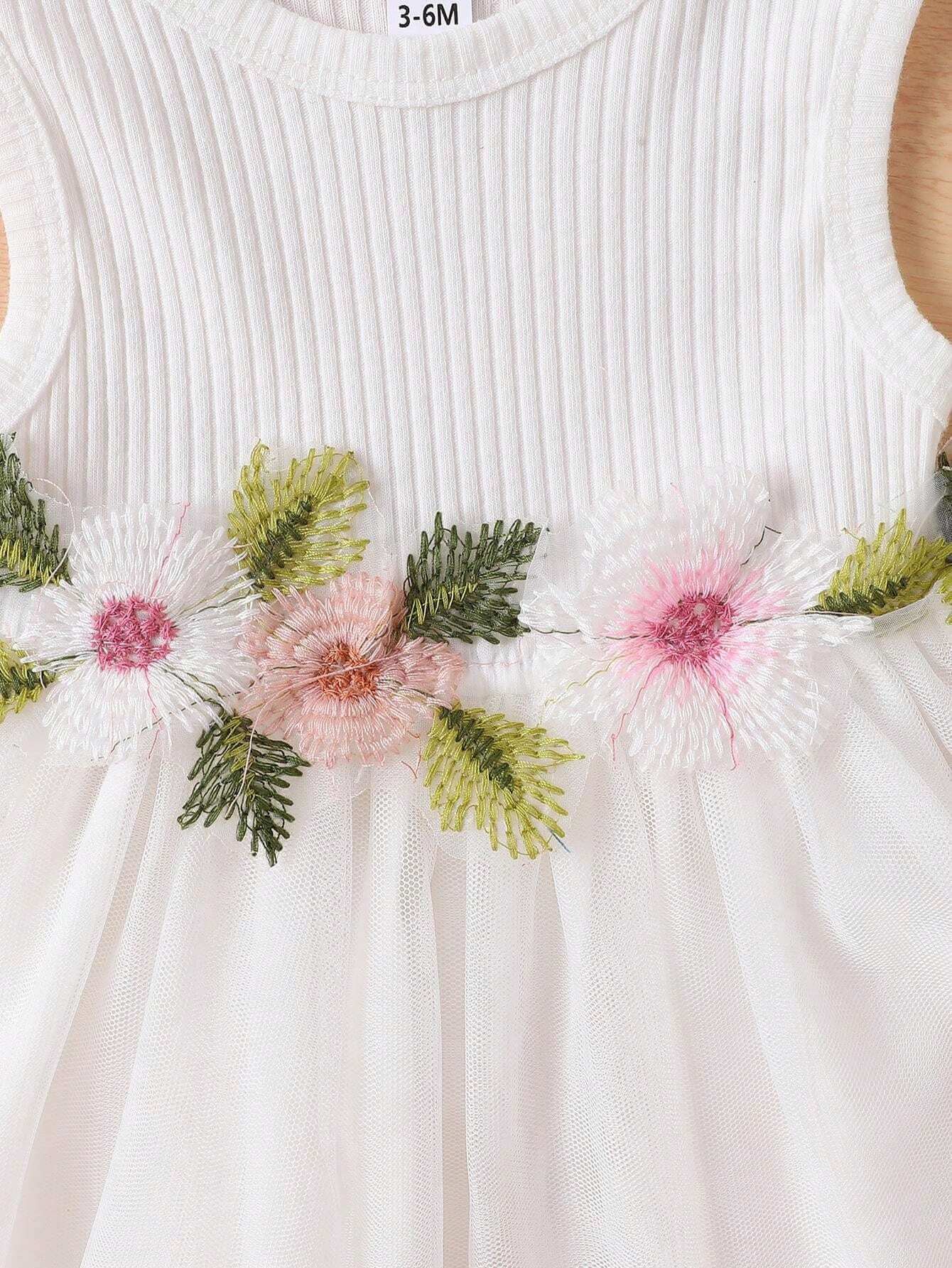 فستان بناتي ربيعي/خريف بدون أكمام مطرز بالورود وشبكة بلون متباين مع جاكيت