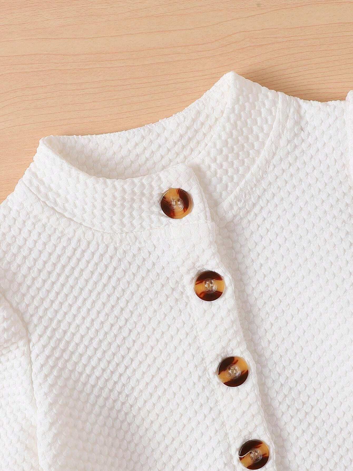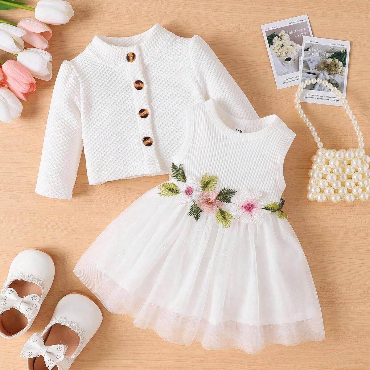 فستان للأطفال بتصميم ناعم من قماش خفيف، يتميز بتطريز ورود ملونة على الخصر وشبكة خفيفة في الطبقة السفلية. يأتي معه جاكيت قصير بأزرار كبيرة ولون متناسق مع الفستان. التصميم بسيط وهادئ، يناسب الأجواء الربيعية والخريفية والمناسبات العائلية