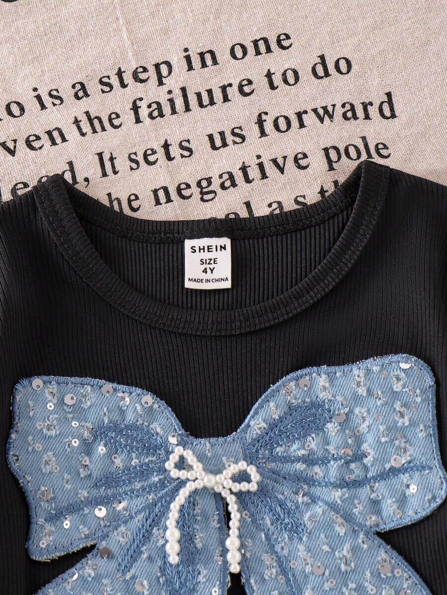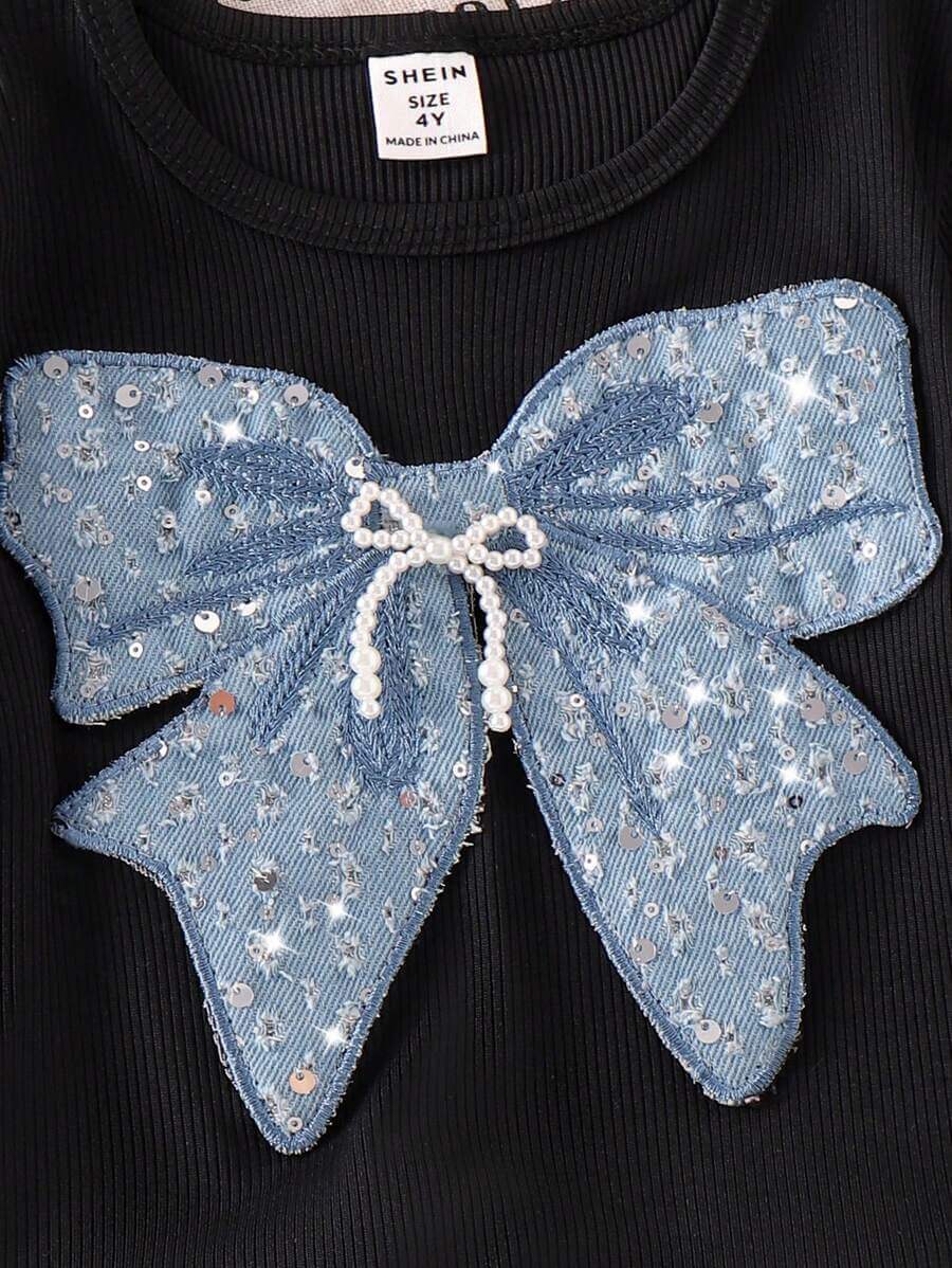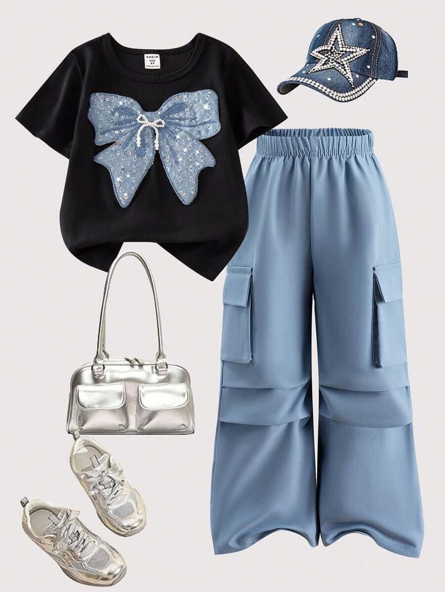 طقم بناتي مكون من قطعتين من تي شيرت بأكمام قصيرة باللون الأسود مع فيونكة زرقاء لامعة وبنطلون كارغو، مناسب للصيف