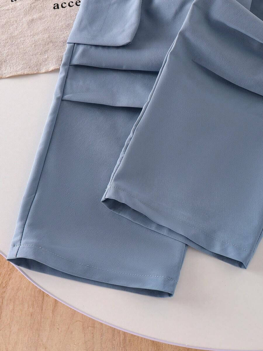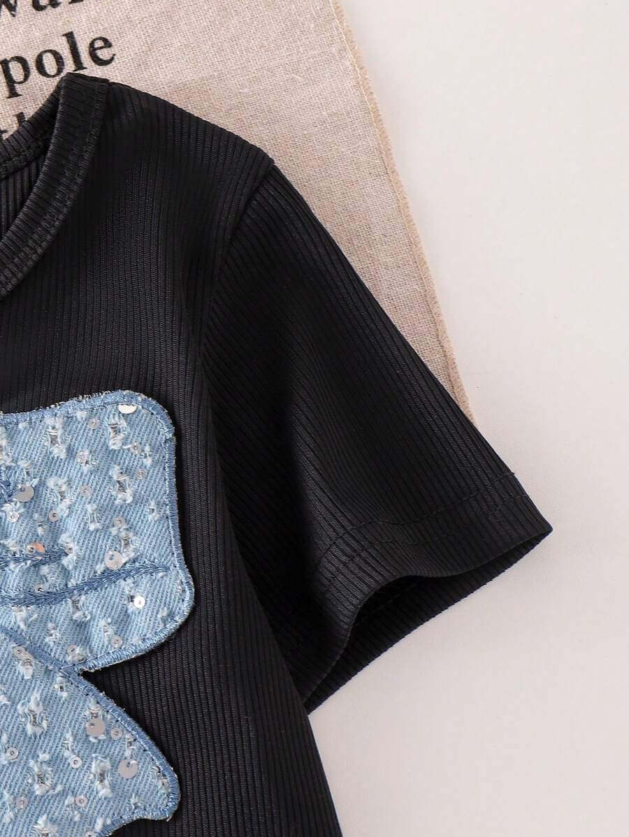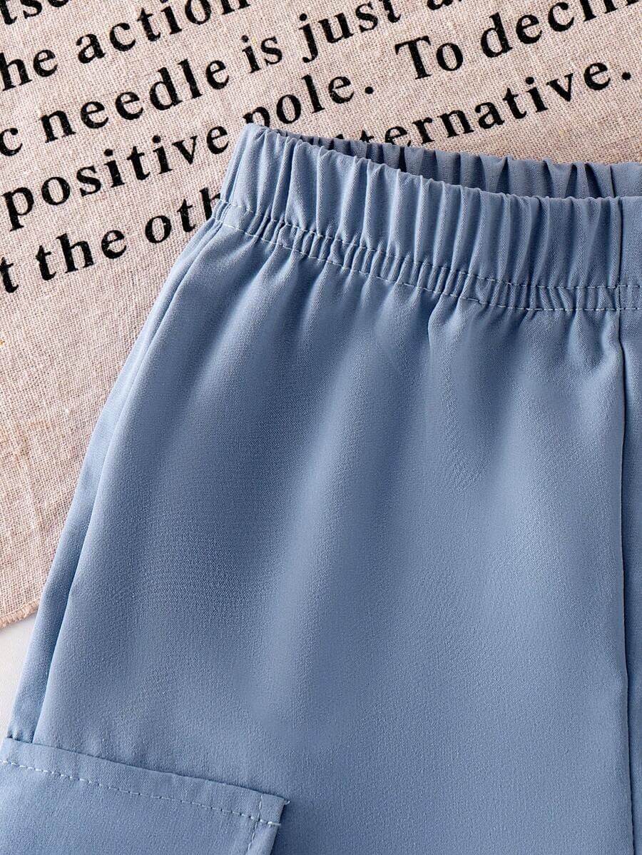 طقم بناتي مكون من قطعتين من تي شيرت بأكمام قصيرة باللون الأسود مع فيونكة زرقاء لامعة وبنطلون كارغو، مناسب للصيف
