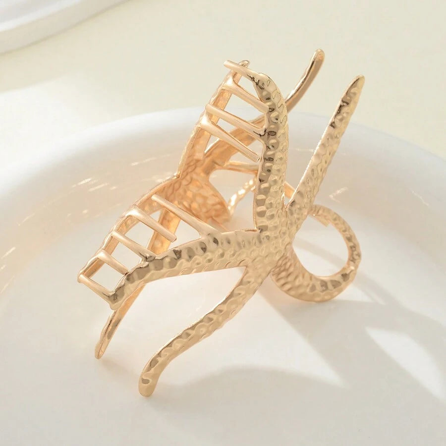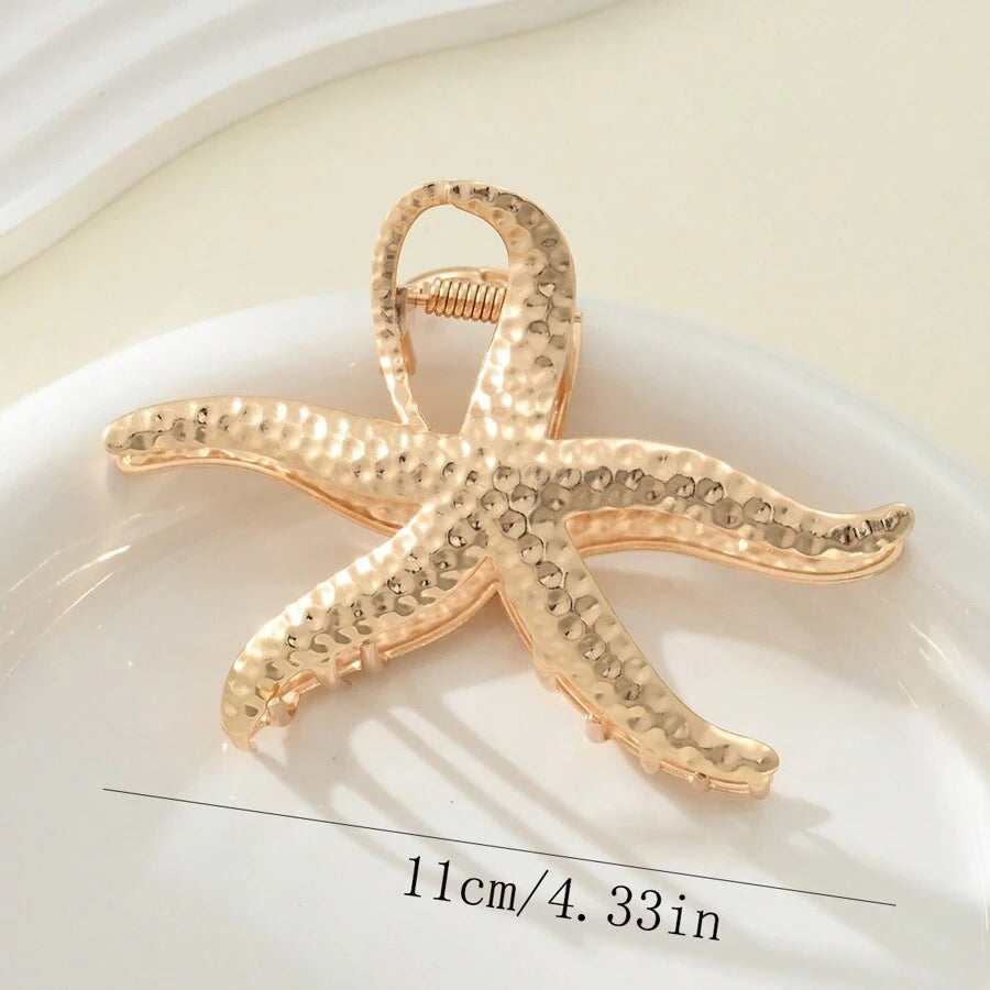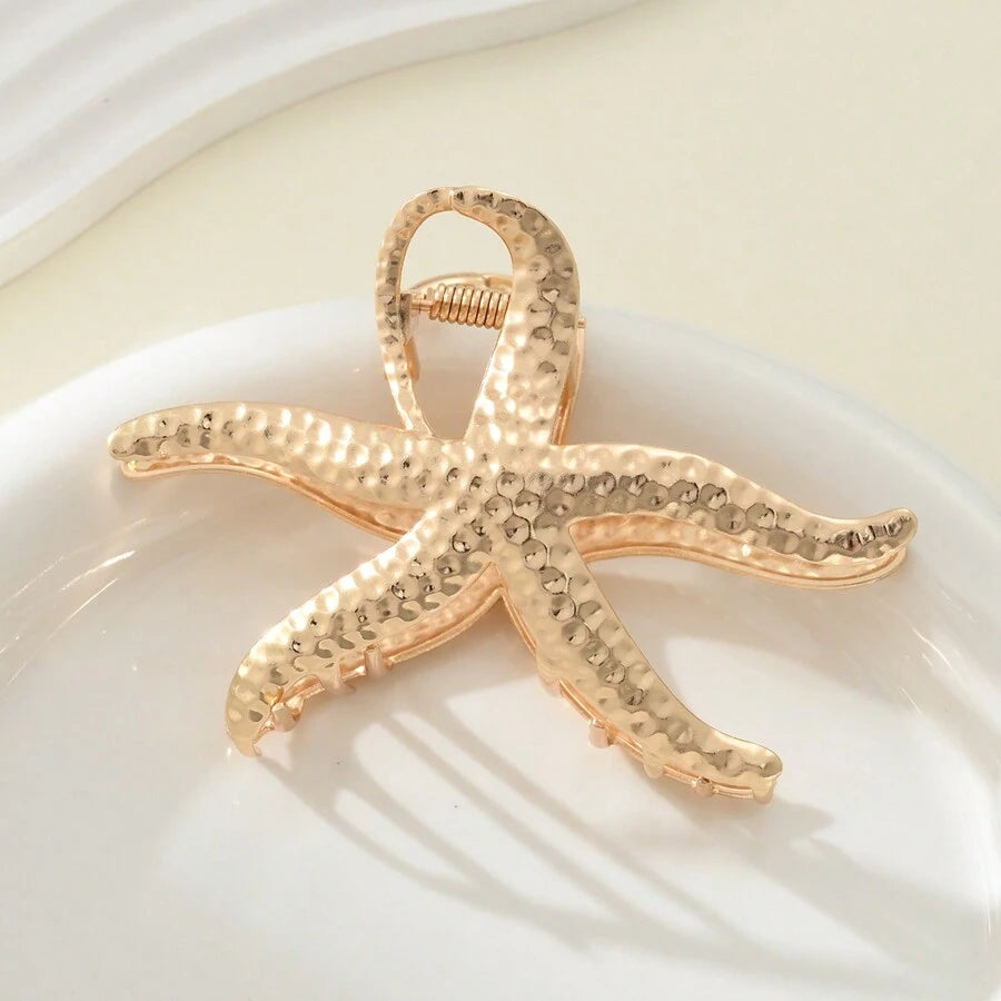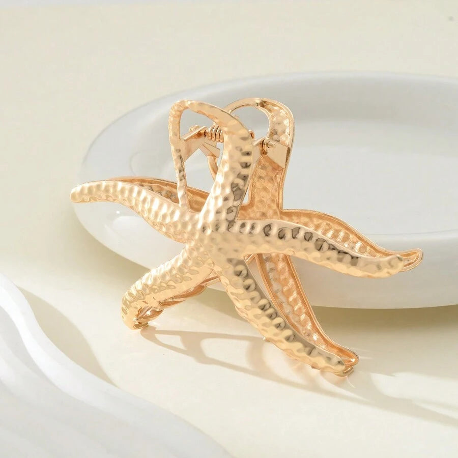 مشبك شعر معدني ذهبي بتصميم نجمة البحر يضيف لمسة راقية لإطلالتك اليومية. مناسب للمنزل، السفر، والرحلات، ويُعد هدية مميزة. عملي وثابت، مثالي لإطلالات الخريف والشتاء ولأزياء الإجازات.