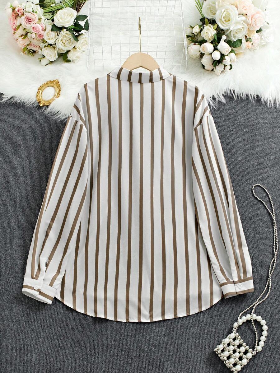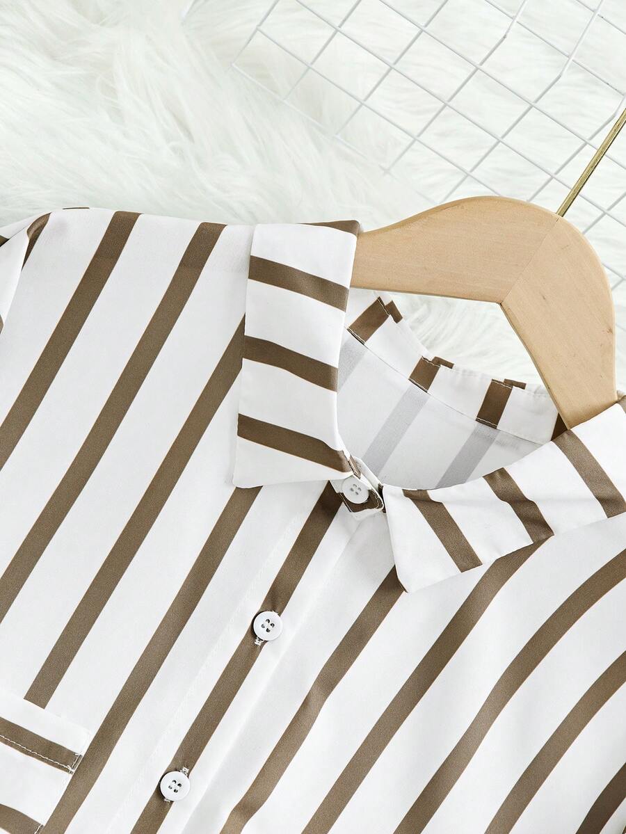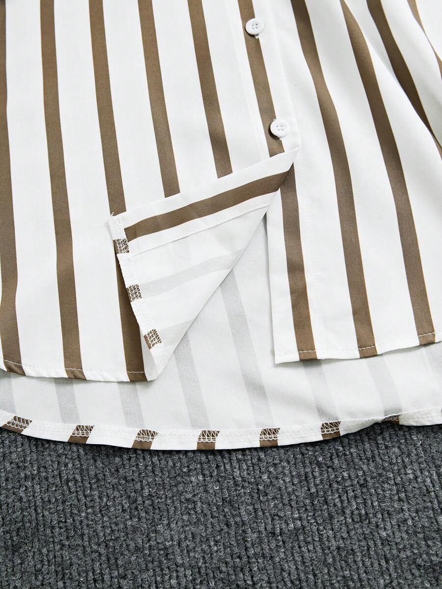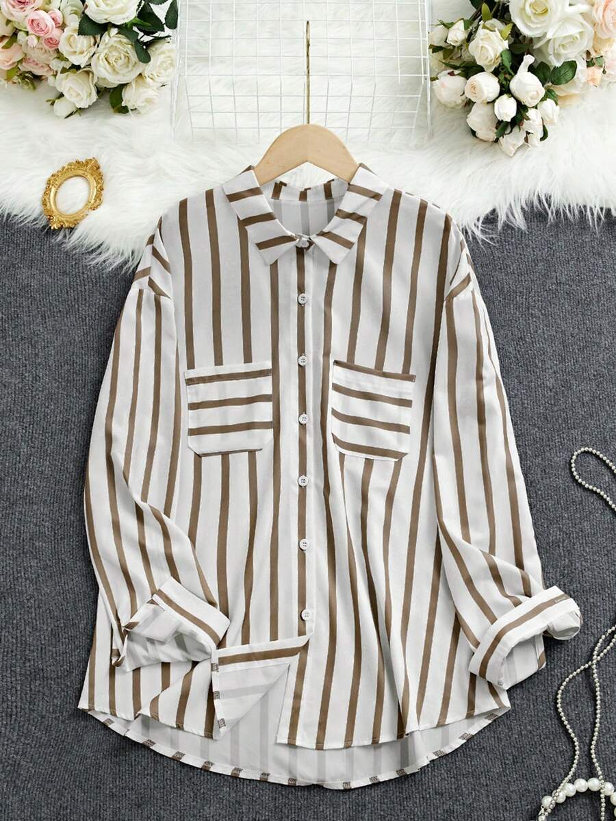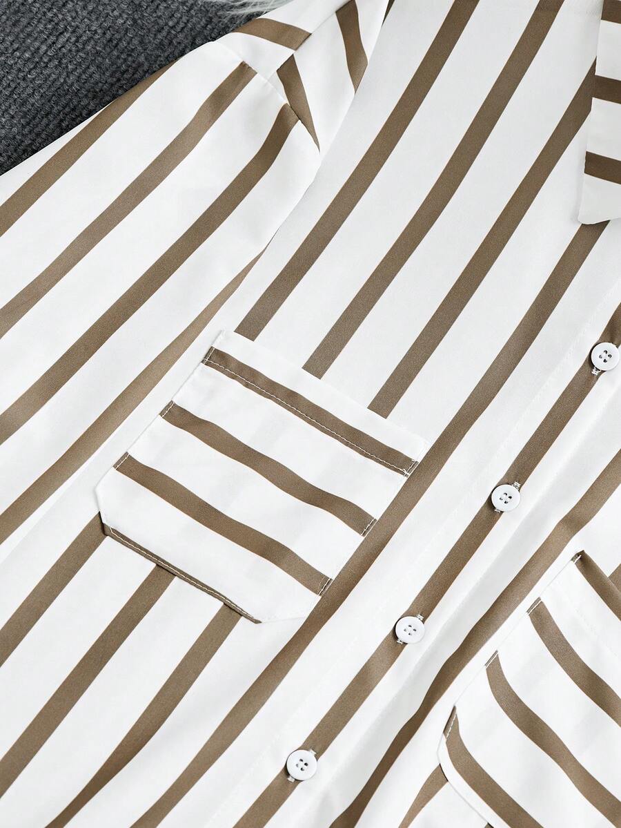 قميص بأكمام طويلة مصنوع من خامة خفيفة وملساء، عليه نقشة خطوط طولية باللونين الأبيض والبني الفاتح. تصميمه كلاسيكي بزرار أمامي وياقة بسيطة، ومع وجود جيبين في الصدر بيضيف لمسة مرتبة للتفاصيل. القماش خفيف ومريح، مناسب للأجواء الدافئة وبيسهّل تنسيقه مع بنطلون أو جيب بلون محايد.