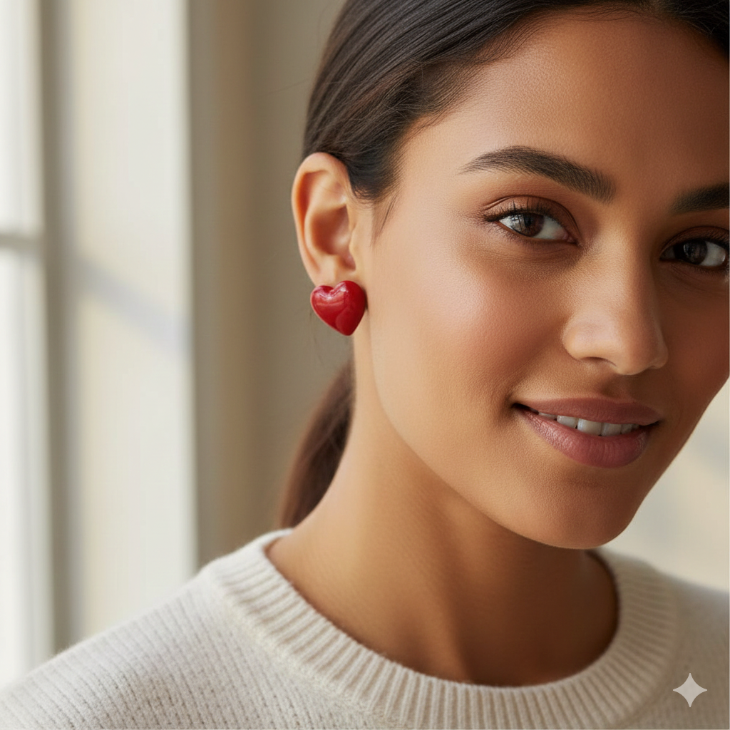 الحلق ده جاي بتصميم قلب بسيط بملمس لامع ولون أحمر واضح بيضيف لمسة ناعمة لأي لوك. شكله صغير ومناسب للّبس اليومي، ومع اللمعة الخفيفة بيظهر بشكل أنيق من غير ما يكون ملفت زيادة. خامته متماسكة وبتدي إحساس خفيف ومريح في اللبس، وبيكمل الإطلالات الكاجوال أو الرقيقة بسهولة.