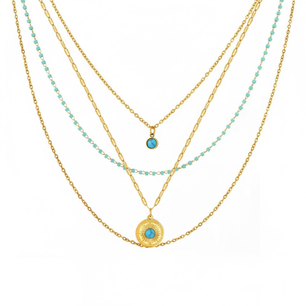عقد متعدد الطبقات بتصميم رقيق يجمع بين السلاسل الذهبية الرفيعة وحبات فيروز صغيرة، مع دلاية صغيرة في المنتصف ودلاية أكبر في الطبقة الأخيرة. شكله بسيط وناعم وبيضيف لمسة مميزة للإطلالات اليومية أو السهرات الخفيفة، مع توزيع متناسق للطبقات يعطي شكل أنثوي هادئ وواضح.