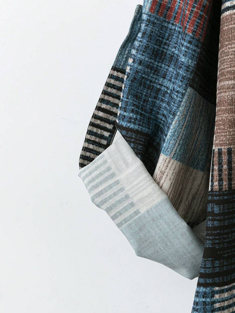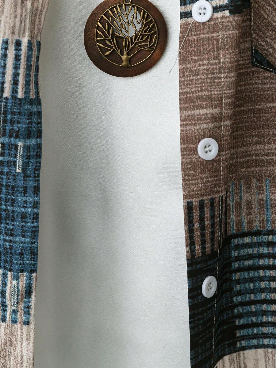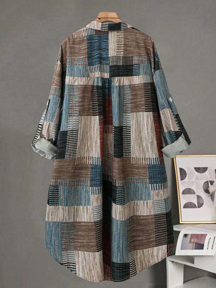 قميص طويل بأكمام يمكن طيّها، مصنوع من خامة خفيفة بنقشة مربعات هندسية بألوان متداخلة زي الأزرق، البني، البيج والنبيتي. تصميمه واسع ومريح، بياقة كلاسيكية وصف أزرار أمامي، مع جيب صغير في الصدر. القماش ناعم وتهويته كويسة، فبيخليه مناسب للّبس اليومي أو كطبقة خفيفة فوق توب بسيط.