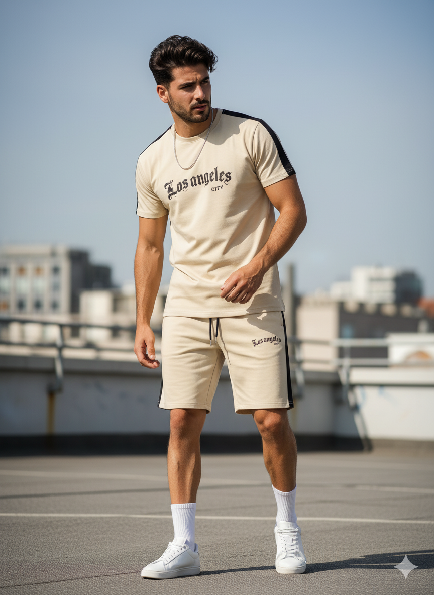 الطقم ده تحفة يا معلم 😎، قميص نص كم وبنطلون قصير بنفس التصميم يدي شكل كاجوال أنيق من الآخر. القماش خفيف ومناسب للفصل الحار، والطبعة بالحروف بتدي لمسة شبابية وجذابة. تقدر تلبسه في البيت أو وكذا خروجة عادية وهيك ستايلك يبقى مرتب جدًا من غير تعب ✌️