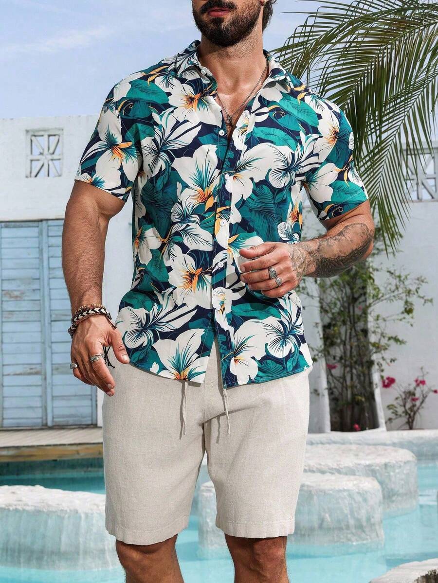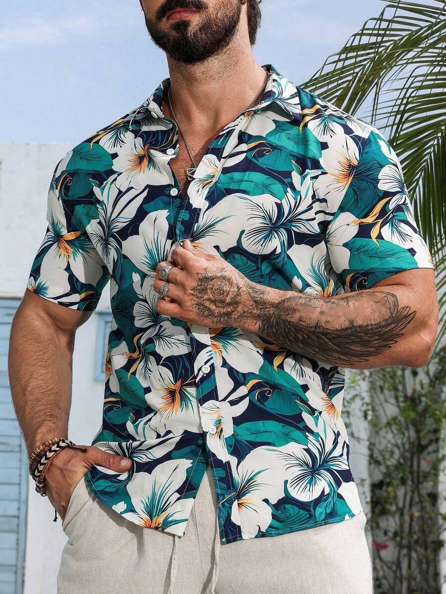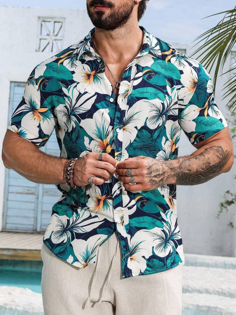 قميص رجالي بأكمام قصيرة ونقشة زهور وأوراق استوائية بألوان متداخلة من الأخضر والأزرق مع لمسات صفراء وبيضاء. تصميم القميص يعتمد على خامة خفيفة مريحة، ويغلق بأزرار أمامية. مناسب للأجواء الحارة والإطلالات الصيفية البسيطة.
