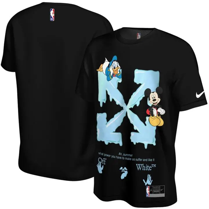 التيشيرت ده تصميمه ملفت بدمج رسومات ميكي ودونالد مع شكل جرافيكي كبير في الخلف، والستايل ده بيدي شكل شبابي وكاجوال مناسب للخروجات اليومية. الخامة قطنية وخفيفة وبتقعد ثابتة على الجسم من غير ما تبقى تقيلة، واللون الأسود بيبرز الطباعة بشكل أنيق وواضح.