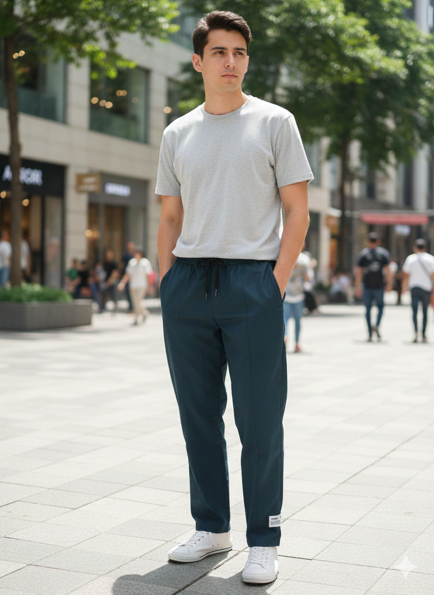 البنطلون شكله بسيط وعملي، معمول من خامة خفيفة مناسبة للخروج اليومي وبتدي راحة في الحركة. التصميم مستقيم وناعم من غير أي تفاصيل زيادة، مع وسط بحبل ربط يدي ثبات كويس. لونه هادي وشكله عصري، ويمشي مع تيشيرتات بسيطة أو جاكيتات خفيفة في اللبس الكاجوال.