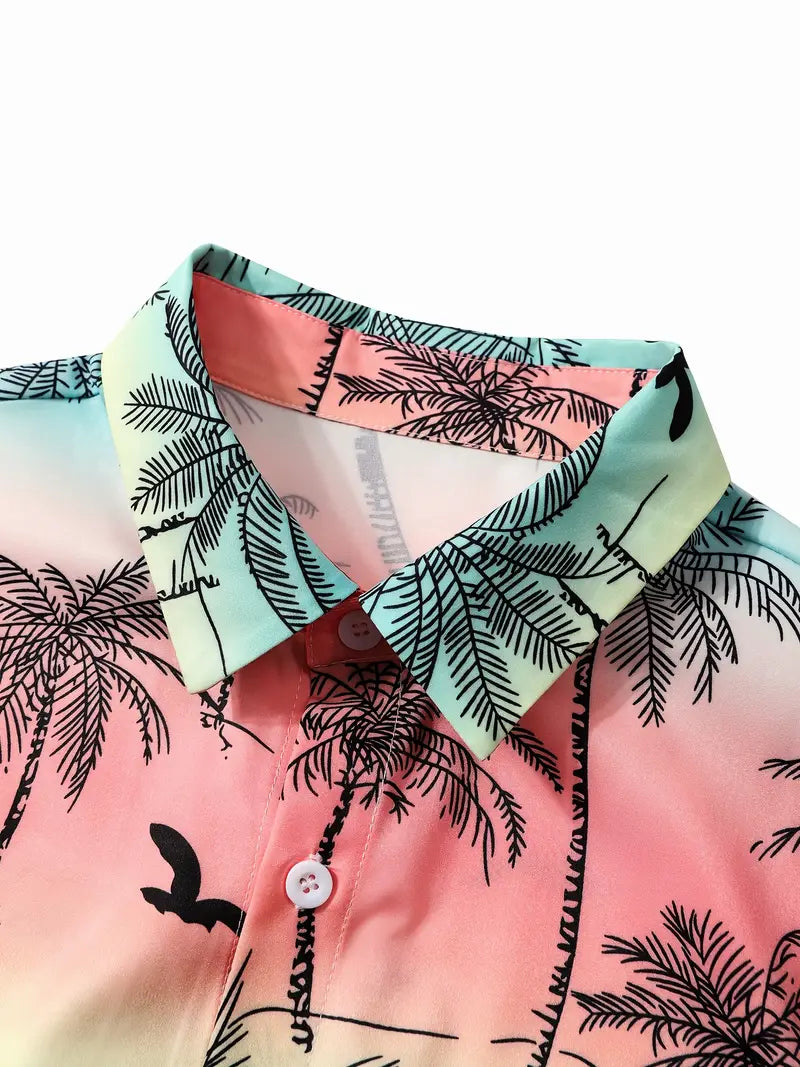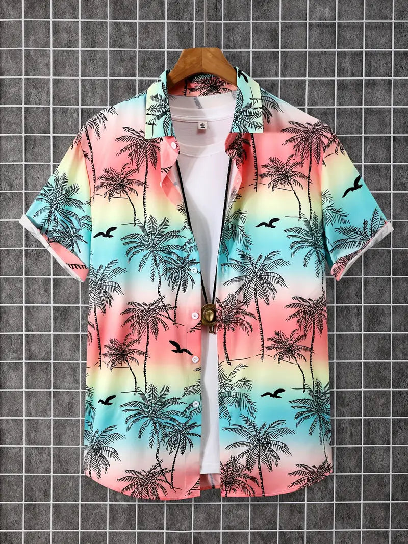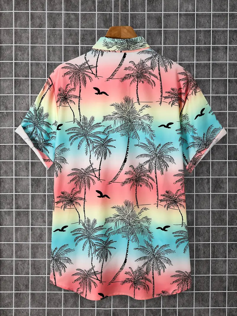 قميص رجالي بأكمام قصيرة بأسلوب هاواي الزاهي مع طباعة نخيل استوائي ونورس