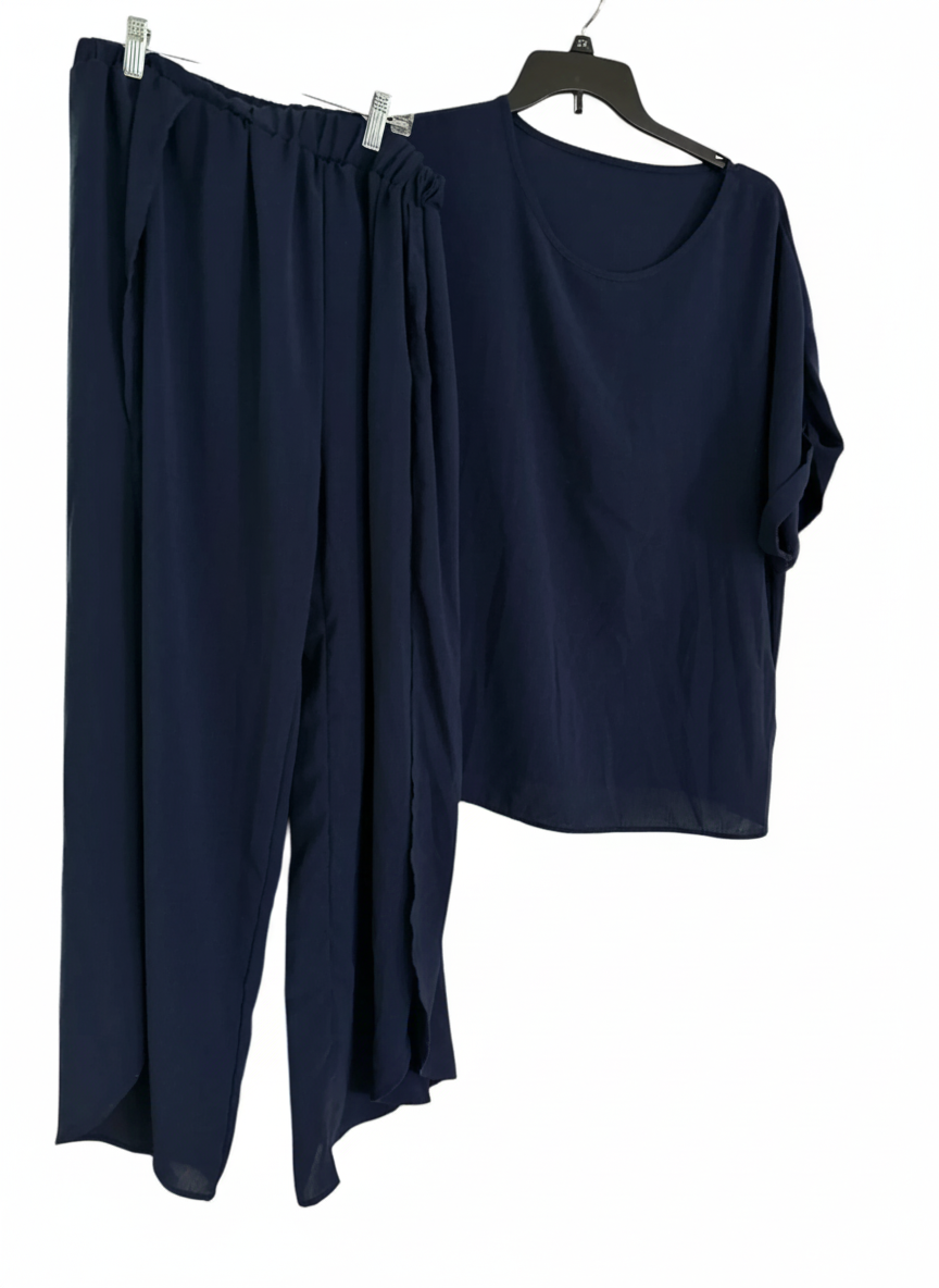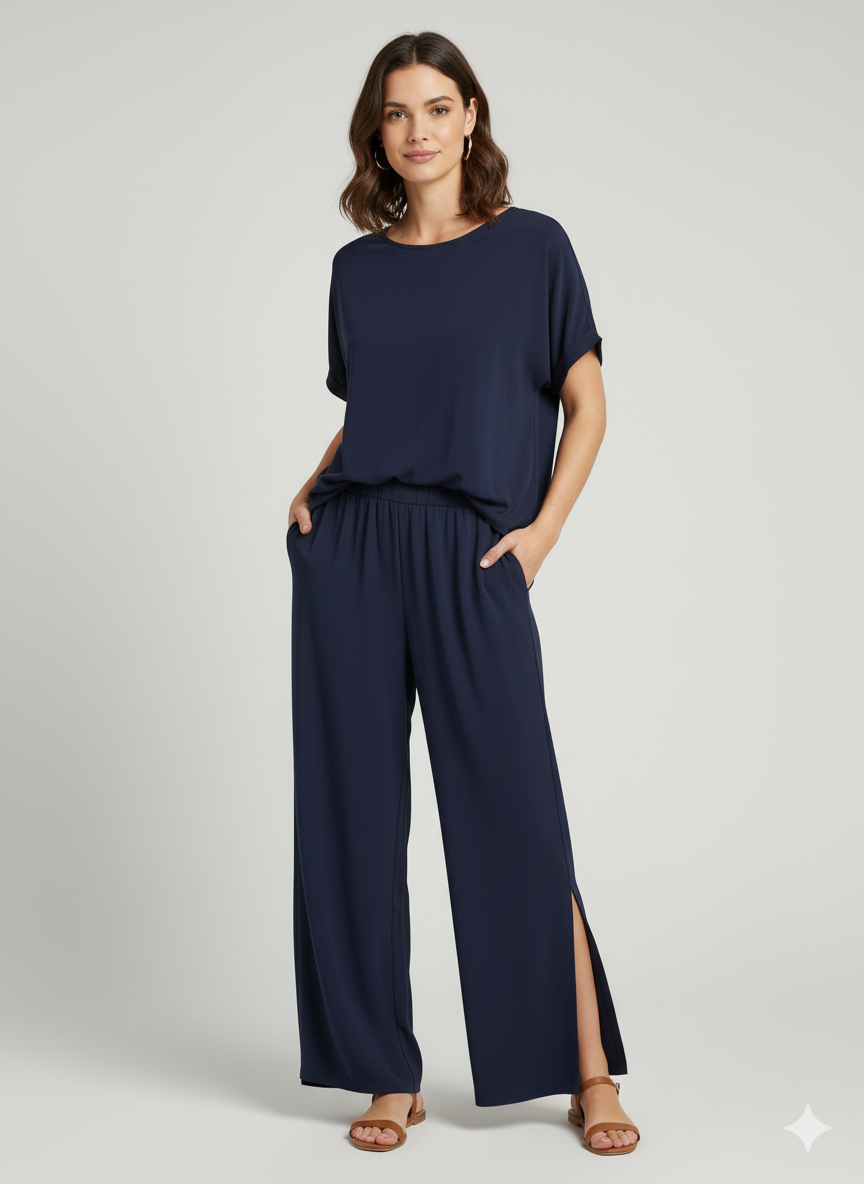 الطقم مكوّن من توب واسع بقصة بسيطة وبياقة دائرية، مع بنطلون بقصة مستقيمة وخصر مطاطي. الخامة خفيفة وناعمة بدرجة تسمح بالحركة بسهولة، والتصميم عامته هادئ ومن غير تفاصيل بارزة. اللون الكحلي مدي شكل موحّد وعملي للقطعتين وبيخليهم مناسبين للّبس اليومي.
