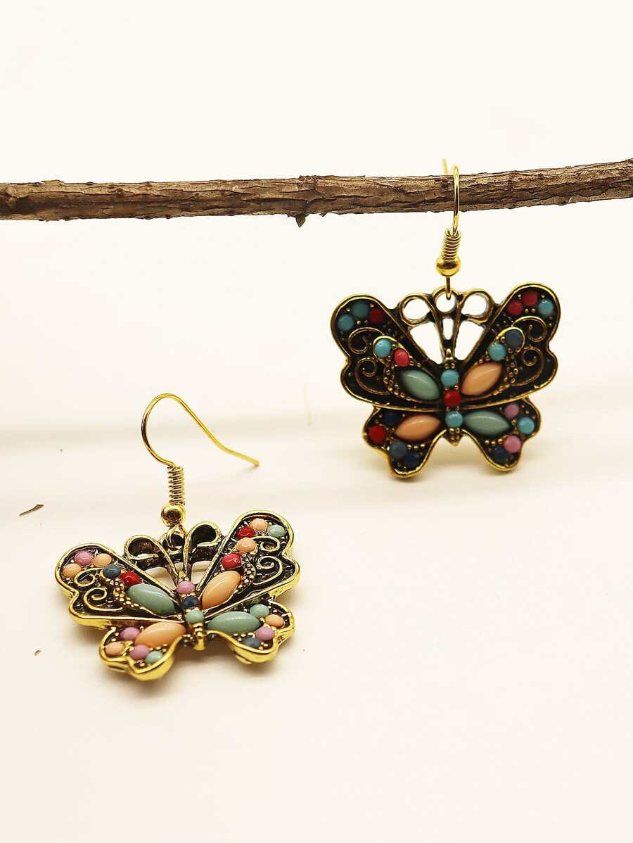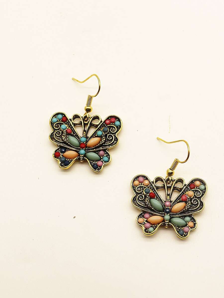 زوج من الأقراط الأنيقة على شكل فراشة بطابع بوهو، مُصنوعة بخامات خفيفة ومسرَّبة باللون، مع خرزات بألوان عشوائية تضيف لمسة فنية مرحة. تصميم رومانسي ودقيق يناسب الإطلالات الصيفية أو إجازات الشاطئ، كما يُعتبر هدية لطيفة وأنيقة للنساء.