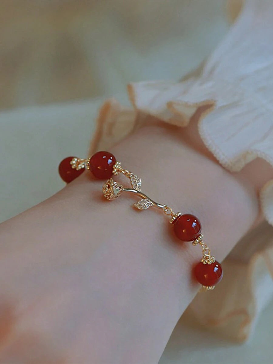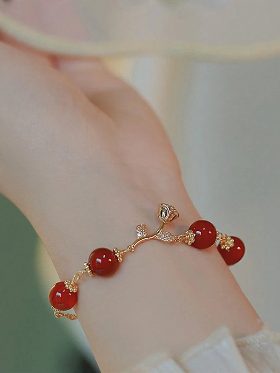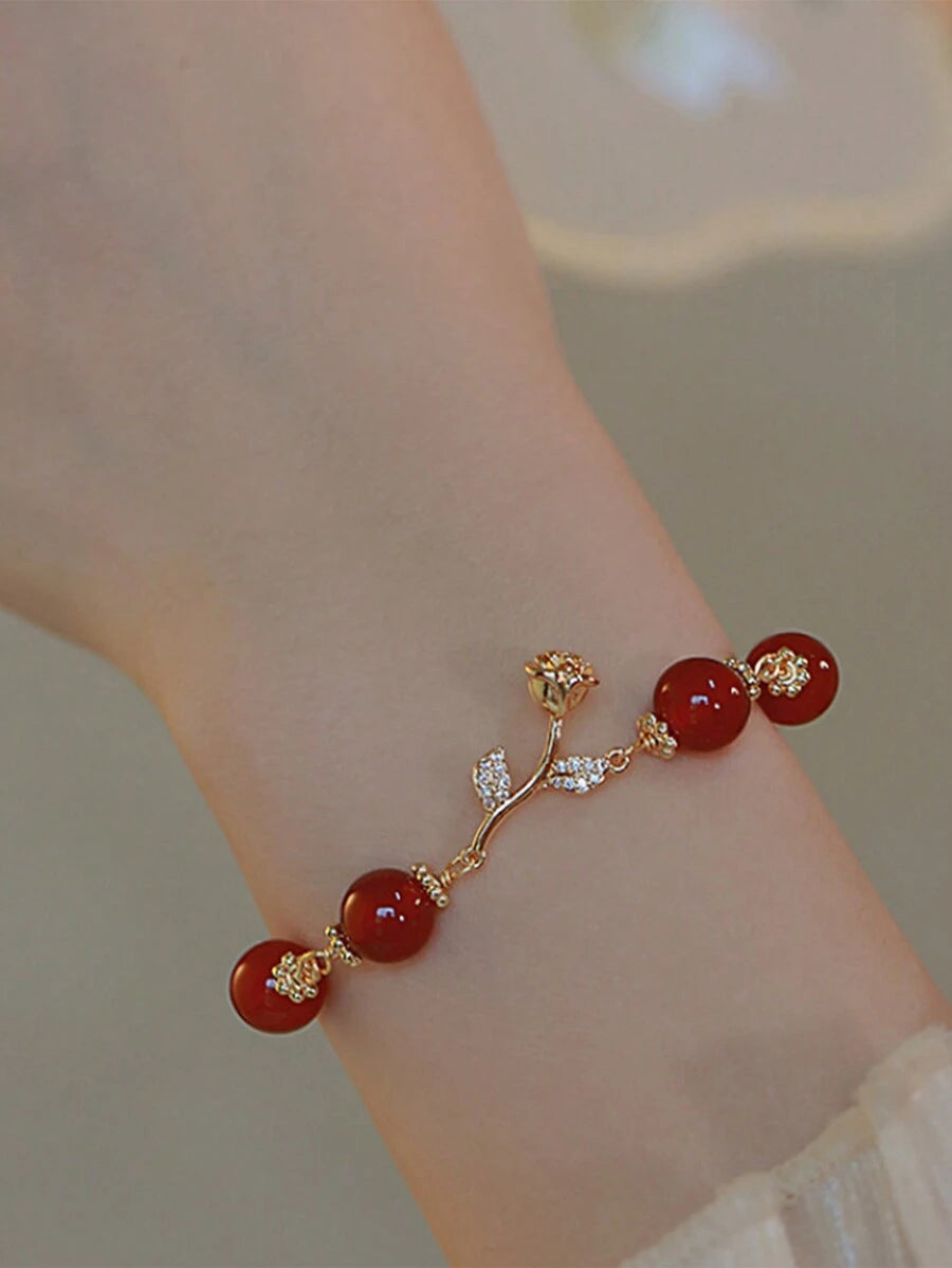 سوار حجر العقيق الأحمر مع كريستال و سلسلة ذهبية على شكل وردة
