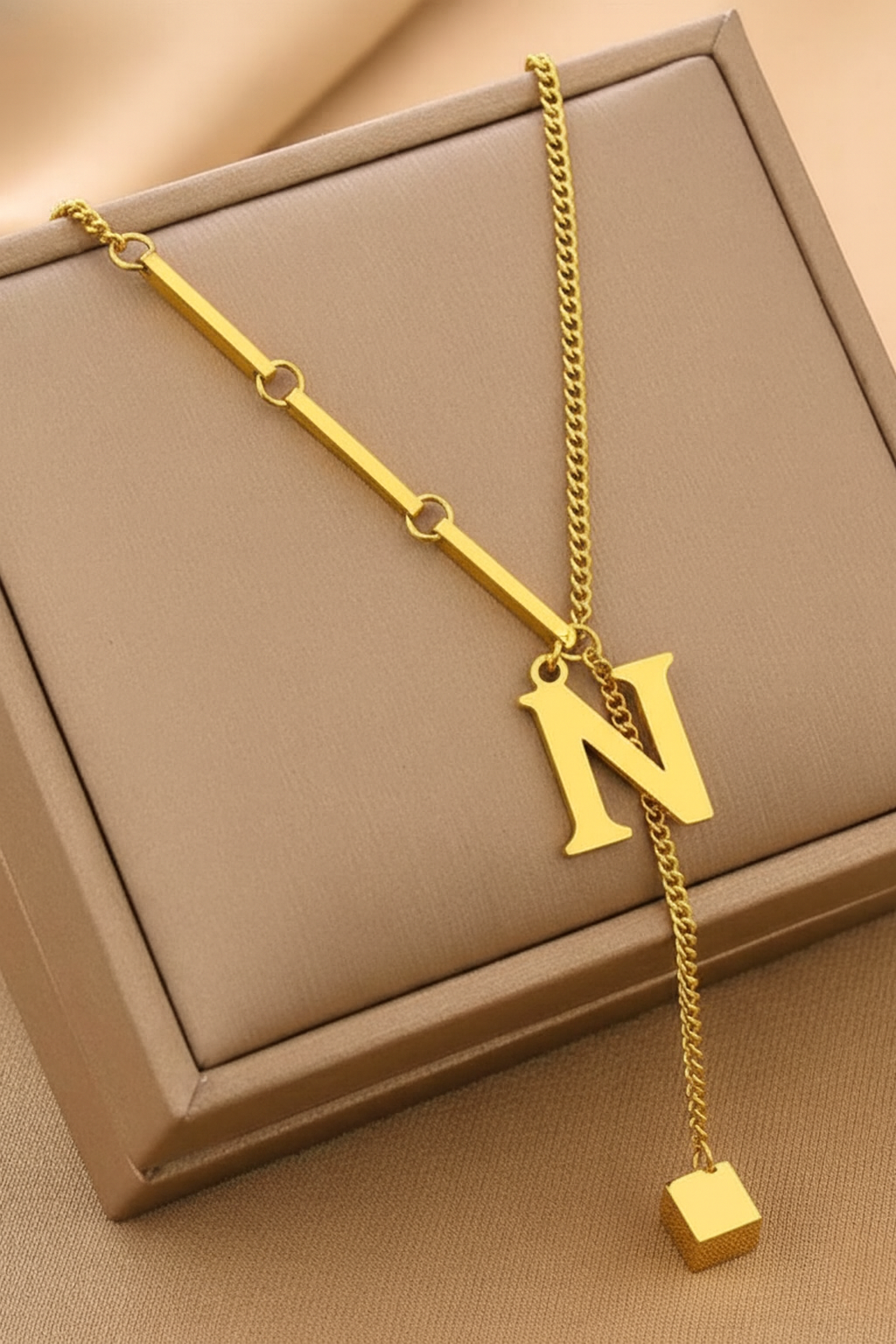 القلادة بتجمع بين تصميم ذهبي بسيط ولمسة عصرية في شكل حرف N المتدلي من السلسلة. الجزء العلوي فيه فواصل صغيرة بتدي شكل أنيق ومنسّق، وفي آخر السلسلة مكعب صغير بيدي حركة خفيفة ونعومة في الإطلالة. الخامة شكلها ثابت ولامع بشكل هادي، والقطعة عمومًا مناسبة للّبس اليومي أو كإضافة بسيطة لإطلالة شيك من غير أي مبالغة.