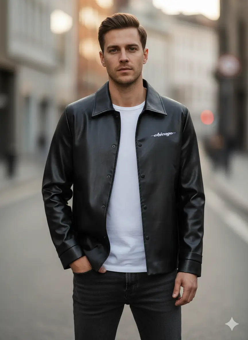 الجاكيت ده تحفة من حيث الشكل 😎 مظهره جلد بيديك لوك قوي وأناقة من غير ما تبقى مبالغ فيه. الطبعة الحروف بتدي تفاصيل جذابة ومناسبة لأي ستايل كاجوال 🎯. خامته صناعية لكن مريحة جدًا ومش هتحسيها تقيلة على الجسم. تلبسيه فوق تيشيرت أو قميص، هيدّيكي طلة حلوة وقوية في نفس الوقت ✨
