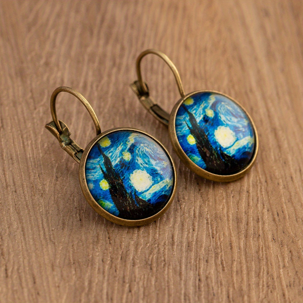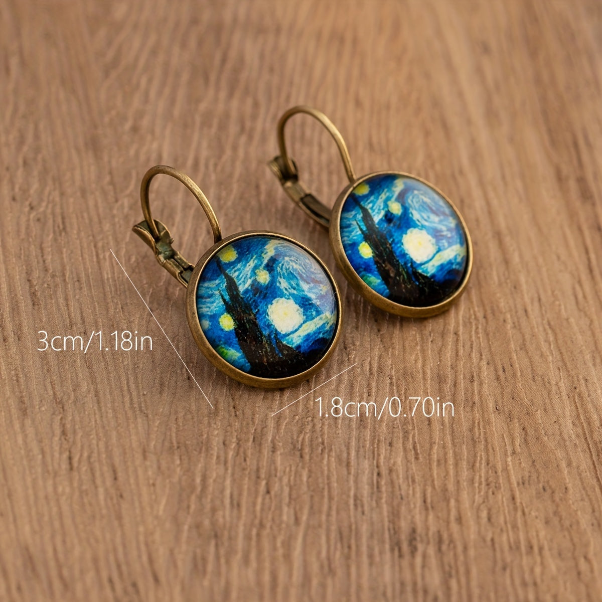 أقراط أنيقة مستوحاة من الطراز العتيق برسمة زيتية لريشة الطاووس وزهرة الهندباء. تصميم دائري فني يضفي لمسة فريدة وجذابة لإطلالتك اليومية أو المناسبات الخاصة.