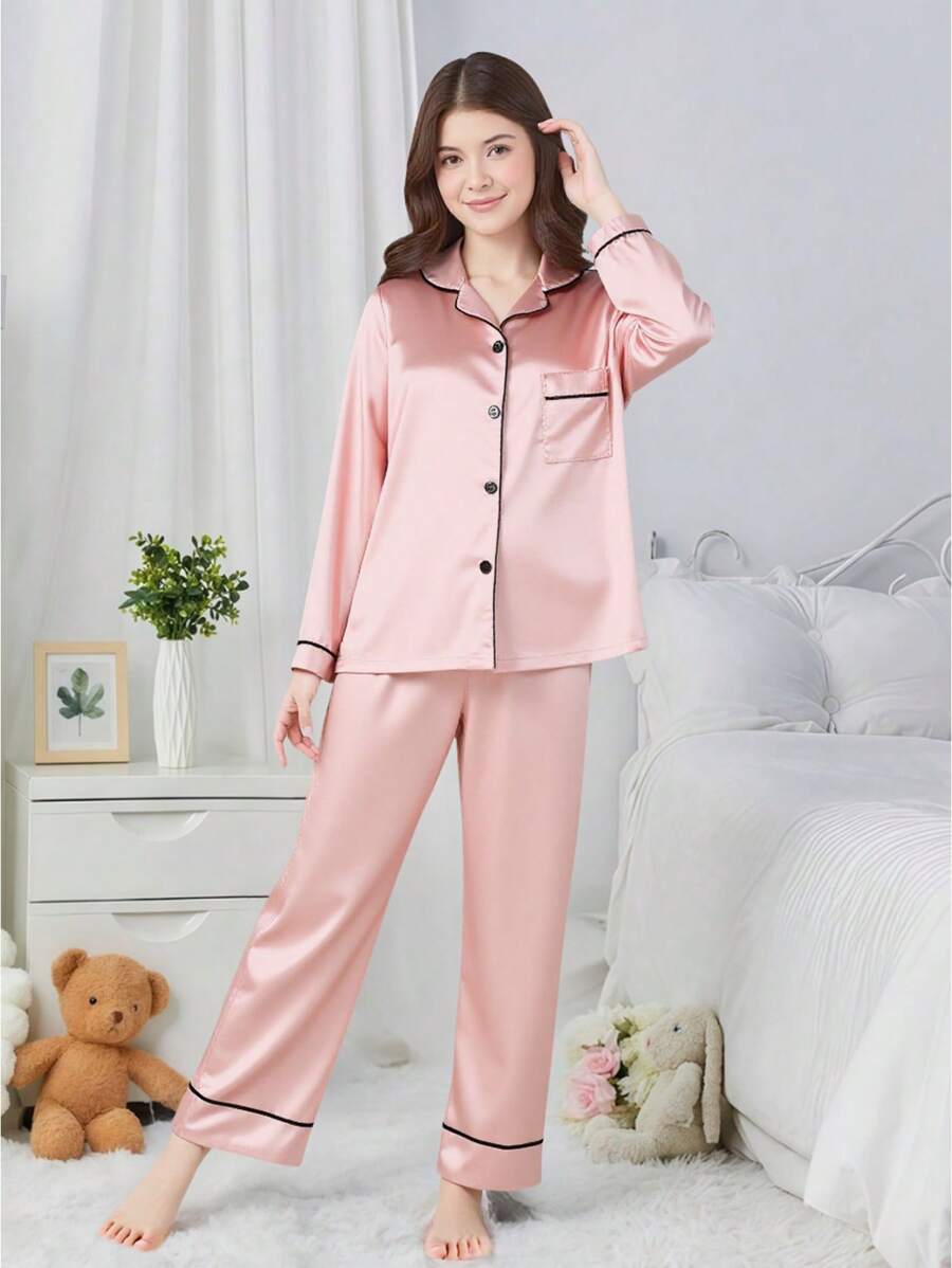 طقم بيجاما ساتان متباين الألوان للفتيات المراهقات