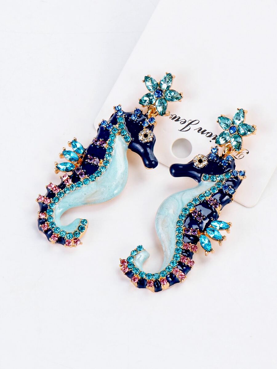 أقراط أنيقة على شكل حصان البحر مزينة بفصوص لامعة تضيف لمسة بحرية ساحرة لإطلالتك. مثالية للمناسبات الخاصة أو لإطلالة يومية مميزة وعصرية.